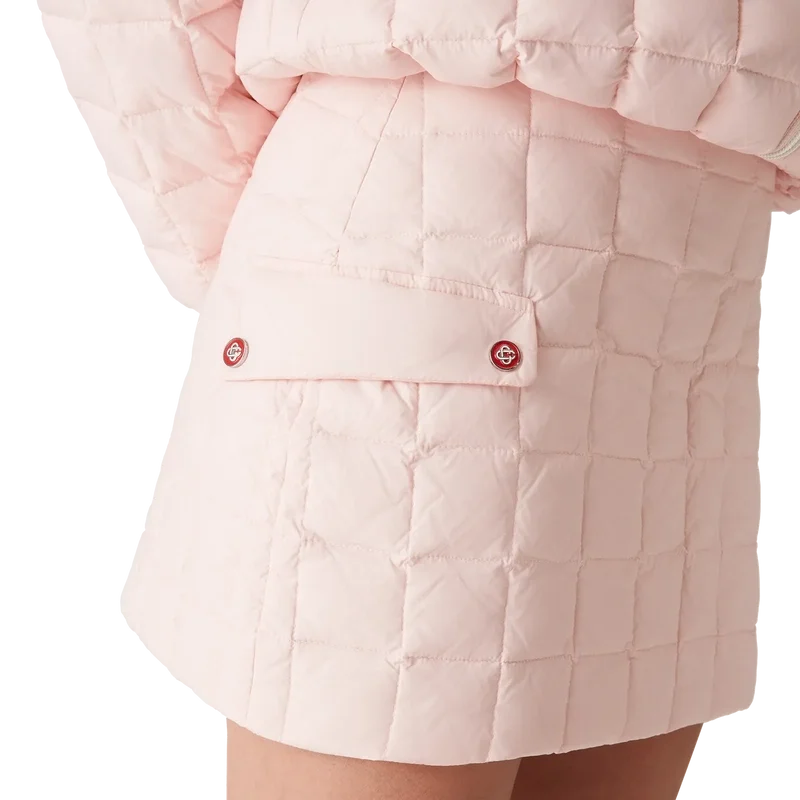 Der gesteppte Mini-Rock aus Nylon ist ein A-Linien-Modell mit quadratischem Steppmuster. Abgerundet wird er durch einen Reißverschluss und eine Pattentasche mit den für das Haus typischen, vergoldeten, emaillierten Druckknöpfen mit flachem Schaft und ineinander verschlungenen C-C-Motiven.