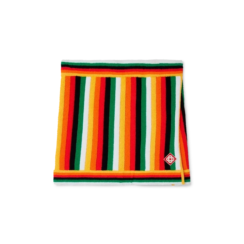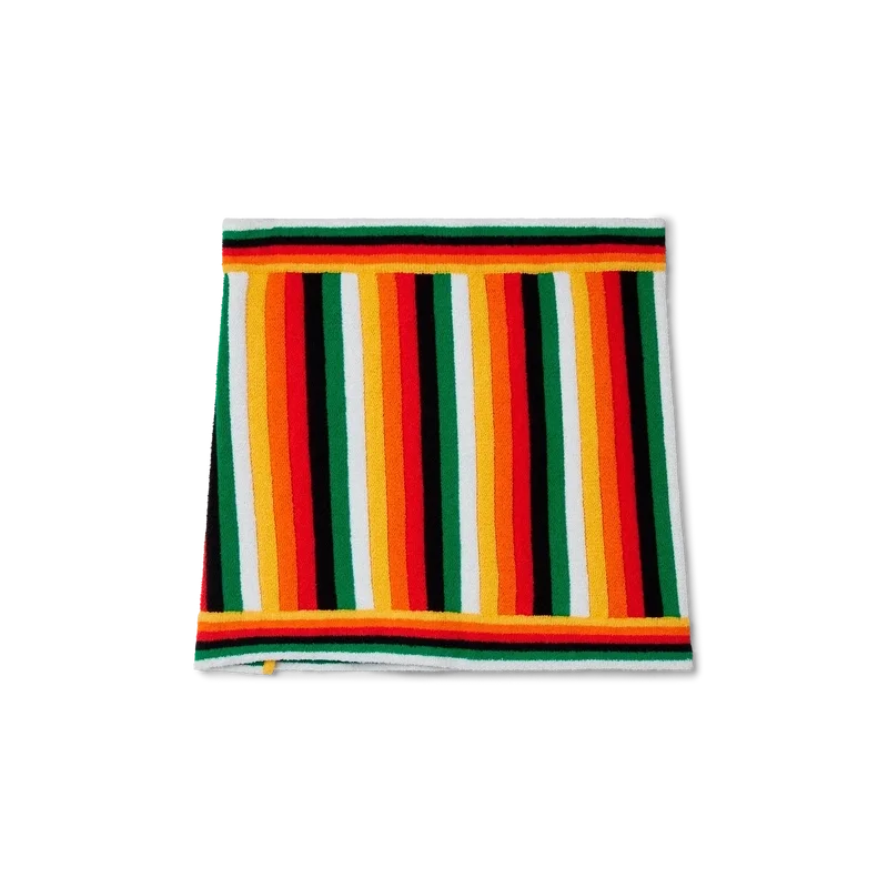 Der gestreifte Frotteerock ist ein Minirock aus einem gestreiften 3D-Frottee-Baumwollmischgewebe in saisonalen Farben und mit dem charakteristischen Rautenlogo des Hauses. Abgerundet durch einen Schlitz sowie horizontale Streifen am elastischen Bund und am Saum.