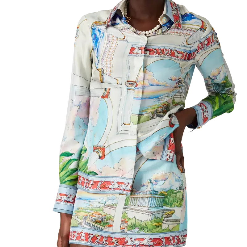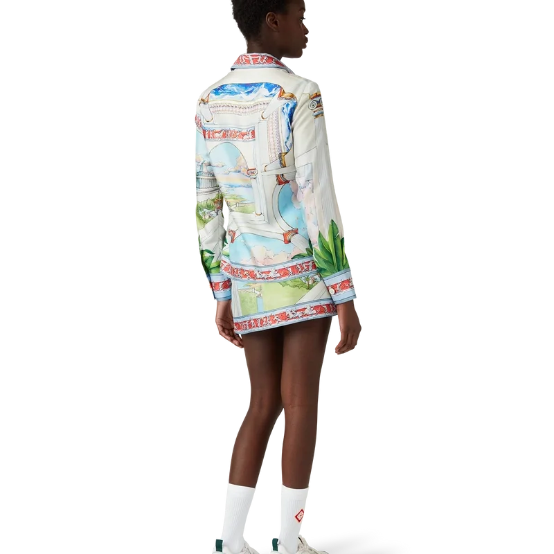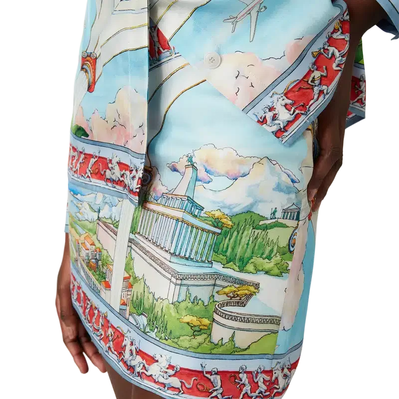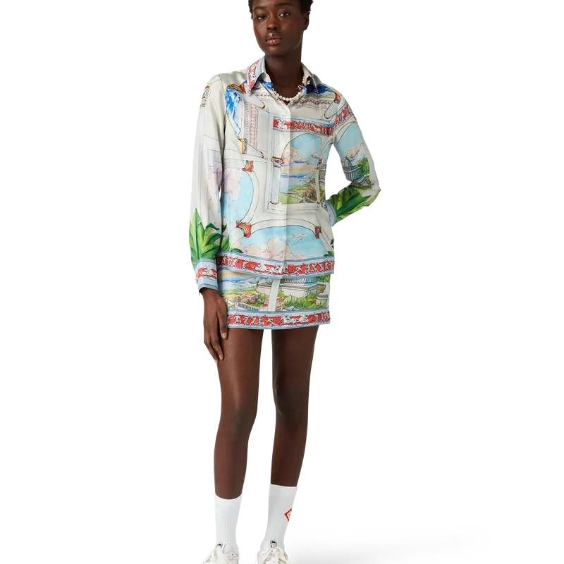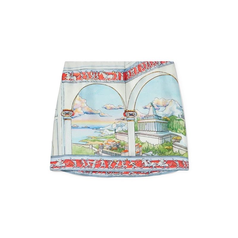 Der Le Passage Seidenminirock ist ein kurz geschnittenes A-Linien-Modell aus Seidentwill, das mit dem saisonalen Kunstwerk des Hauses verziert ist – es präsentiert vier verschiedene Dimensionen, die mit Perspektiven und Architektur spielen. Abgerundet wird er durch einen Reißverschluss und einen vom griechischen Schlüsselmuster inspirierten Saum.