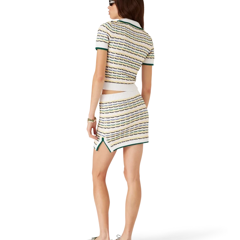 Der Minirock aus Baumwollstrick mit Tuck-Stich ist ein kurzes Modell aus Baumwollstoff. Mit elastischem Rippenbund, Seitenschlitzen und Saum mit kontrastierenden Kantenverzierungen.