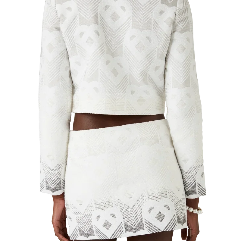 Der Mini-Rock aus Frottee mit Herz-Monogramm im Farbverlauf ist ein durchgehend bedrucktes Design, das das Herz-Monogramm des Hauses auf dem grauen Farbverlaufshintergrund dieser Saison zeigt. Er ist aus einem Monogramm-Frotteestoff gefertigt und mit einem Reißverschluss versehen.