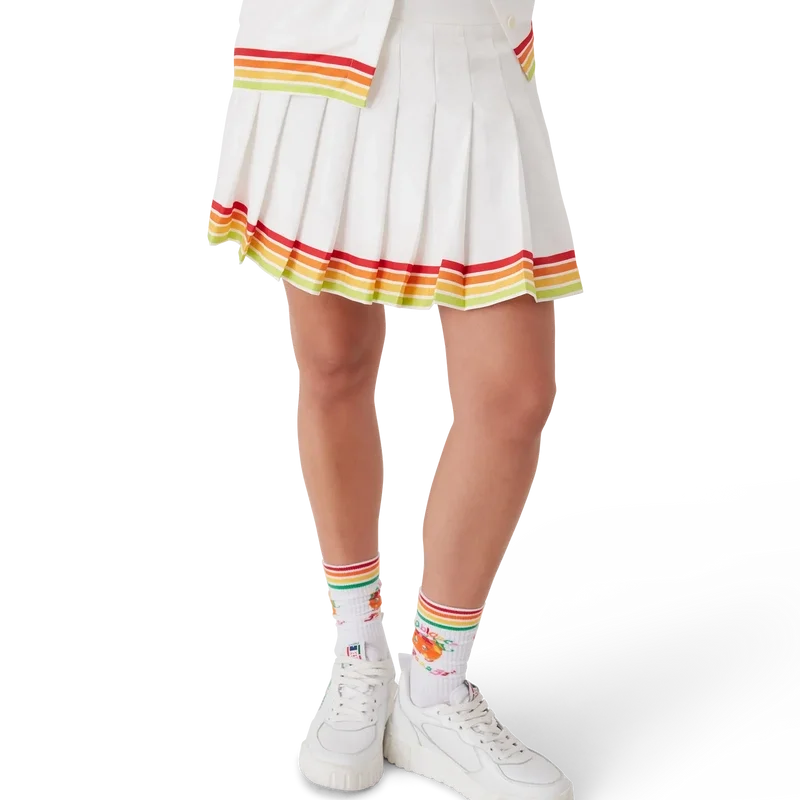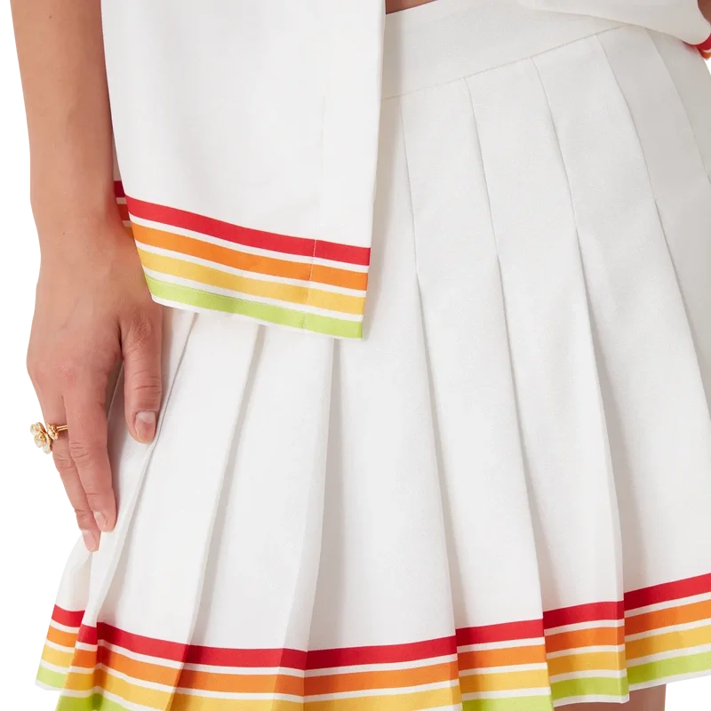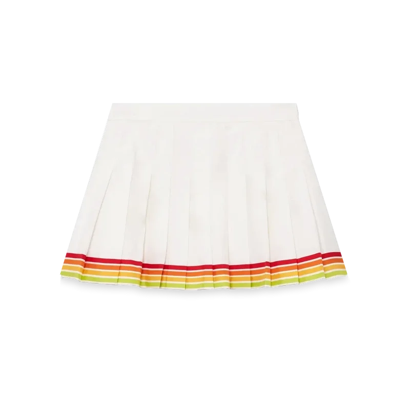 Der orangefarbene Mascot-Seidentwill-Plisseerock ist ein klassisches Design aus Seidentwill. Mit Bund, Reißverschluss, Futter und einem Saum mit roten, orangefarbenen, gelben und grünen Streifen.