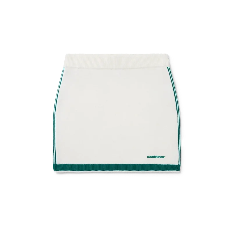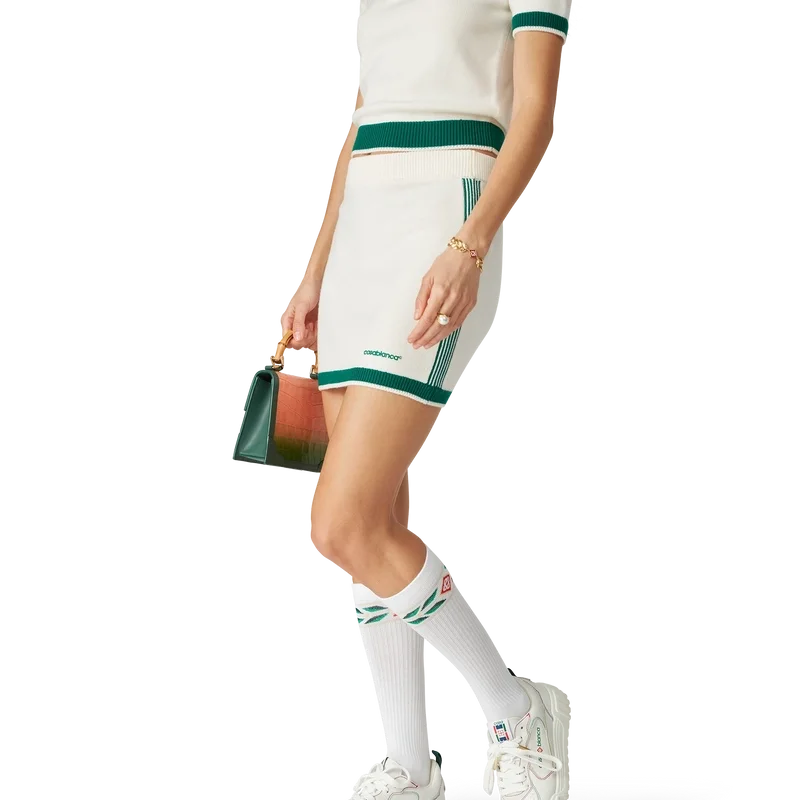 Der gestrickte Tennisrock ist ein figurbetonter Mini-Rock aus Merinowolle. Mit elastischem Bund, kontrastierendem Saum, Streifen an den Seiten und dem Casablanca-Logo.