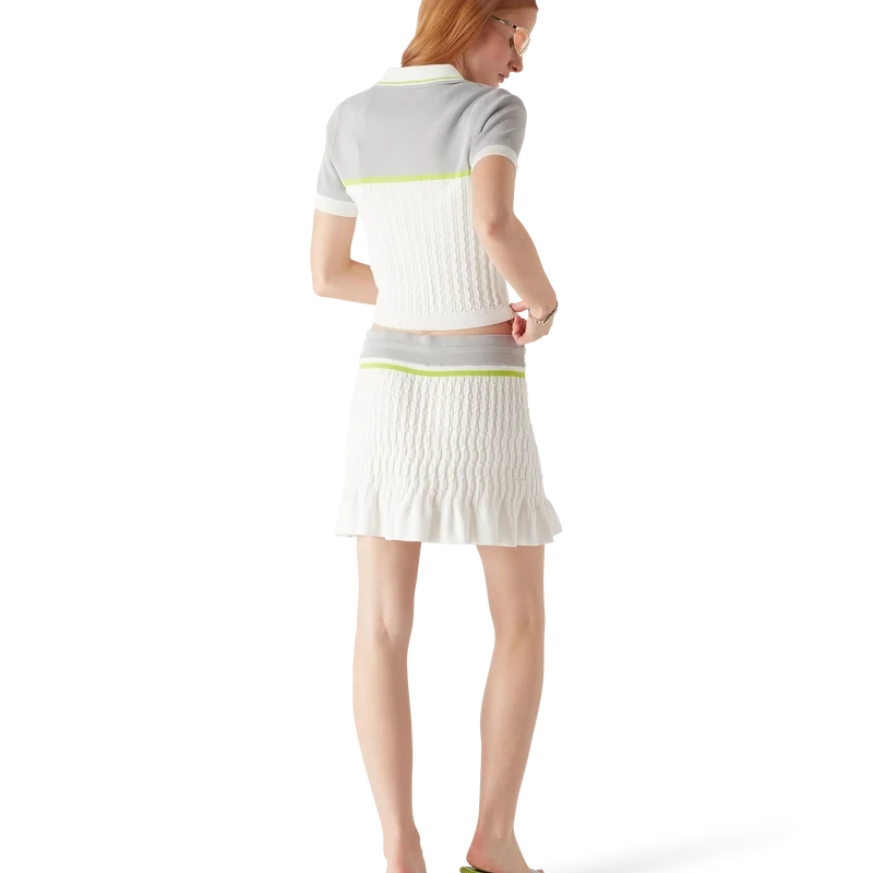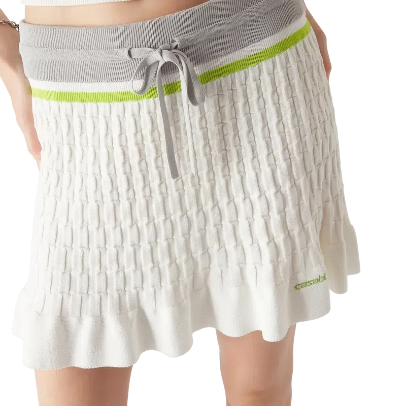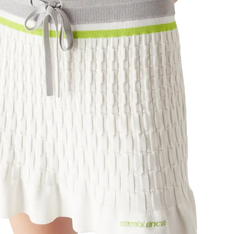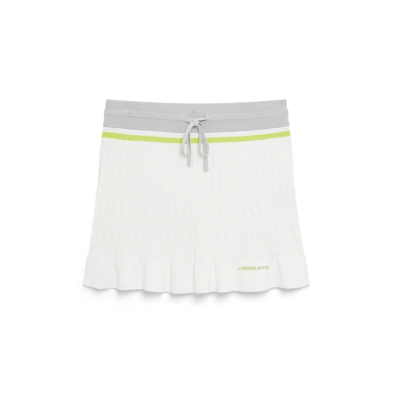 Der Tennis-Mini-Rock ist ein Strickmodell mit dem „Casablanca“-Logo des Hauses. Er verfügt über einen elastischen Bund, einen Kordelzug, einen Reißverschluss am Saum mit dem charakteristischen Diamant-Logo des Hauses als Reißverschlusslasche, einen hohen Kragen, Streifenmuster, das charakteristische „Casablanca“-Logo, gerippte Bündchen und einen Rüschen-Saum.