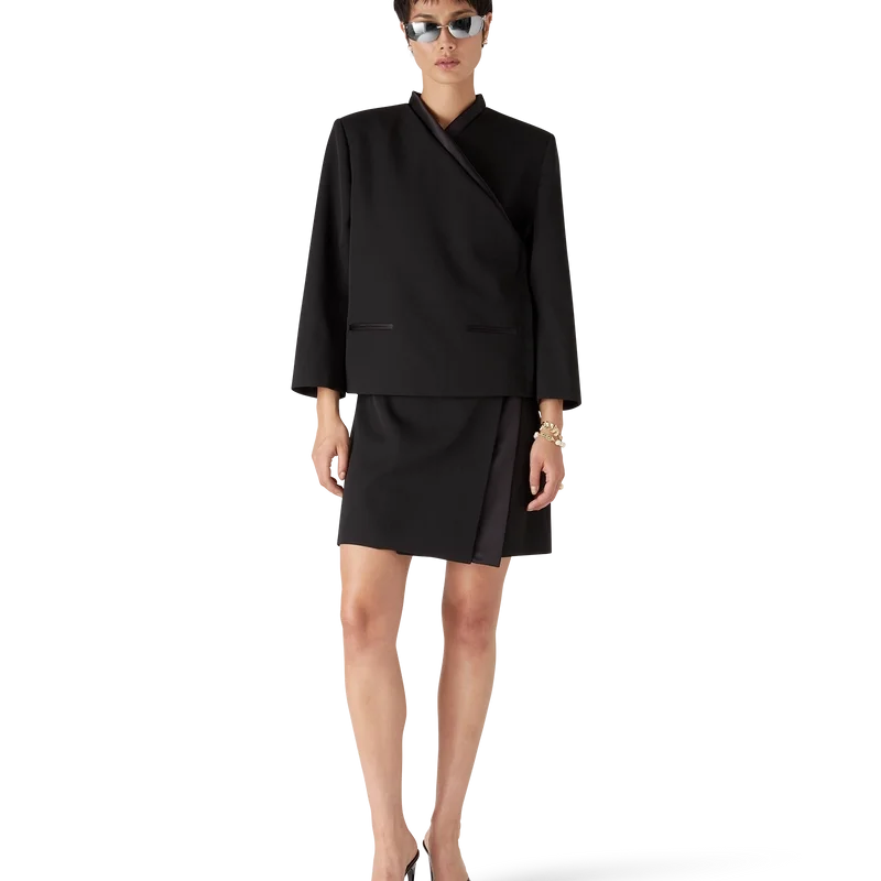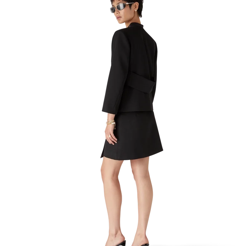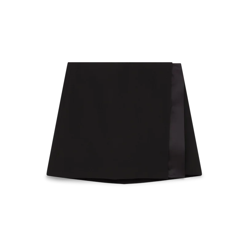 Der Wickelrock aus Woll-Tailoring-Stoff ist ein kurzes Modell aus Woll-Tailoring-Stoff. Mit einem flachen Cc-Logo-Knopf, einem Schlitz vom Saum bis zur Taille und einer schwarzen Kontrastfalte entlang des Schlitzes.