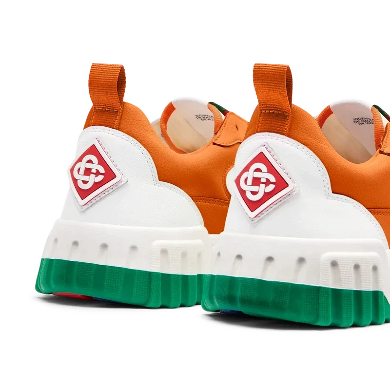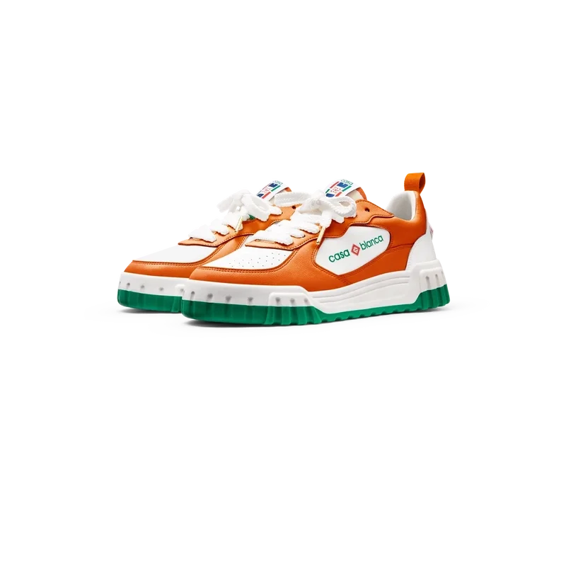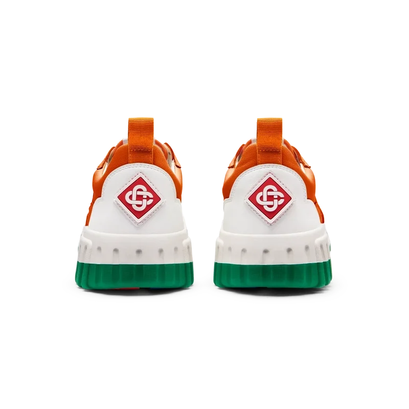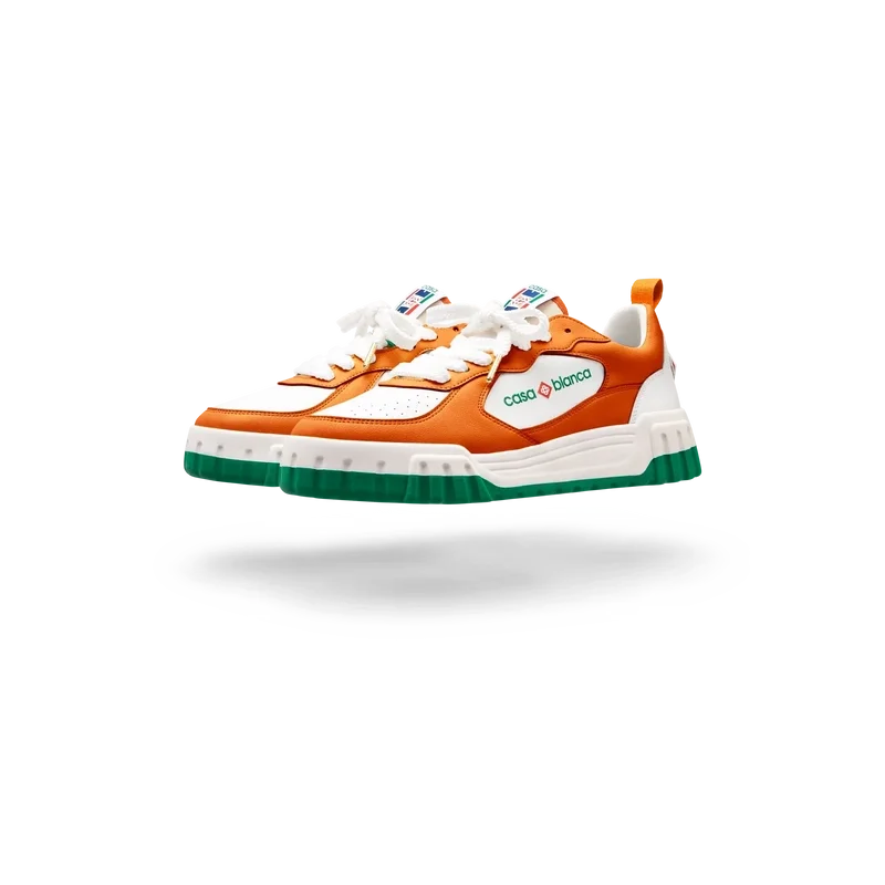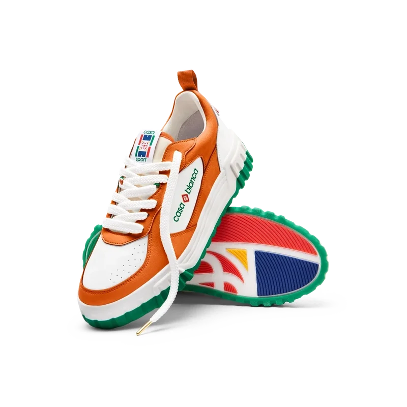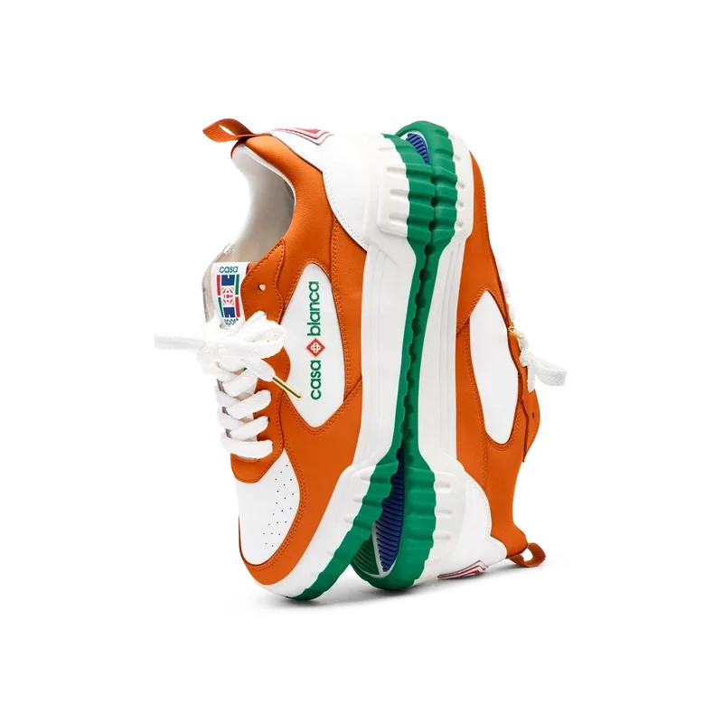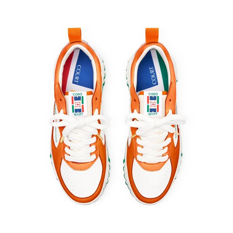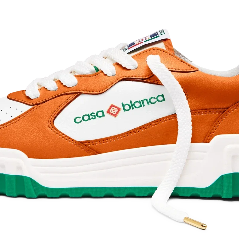 Das markante Casablanca-Branding ist überall deutlich zu erkennen, einschließlich des charakteristischen Diamantmotivs der Marke an der Ferse, des seitlichen Silikon-Wortzeichens sowie des gewebten Zungenetiketts und der Einlegesohle mit Tennisplatz-Motiv, die dem Schuh seinen Namen „The Court“ geben.