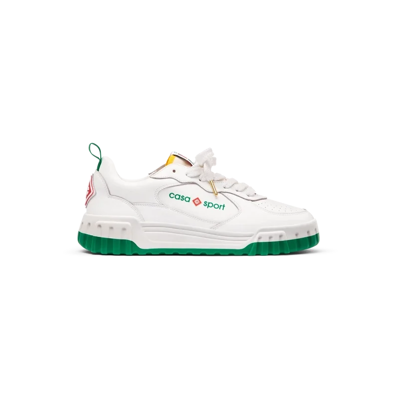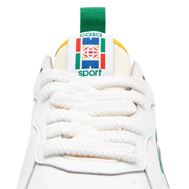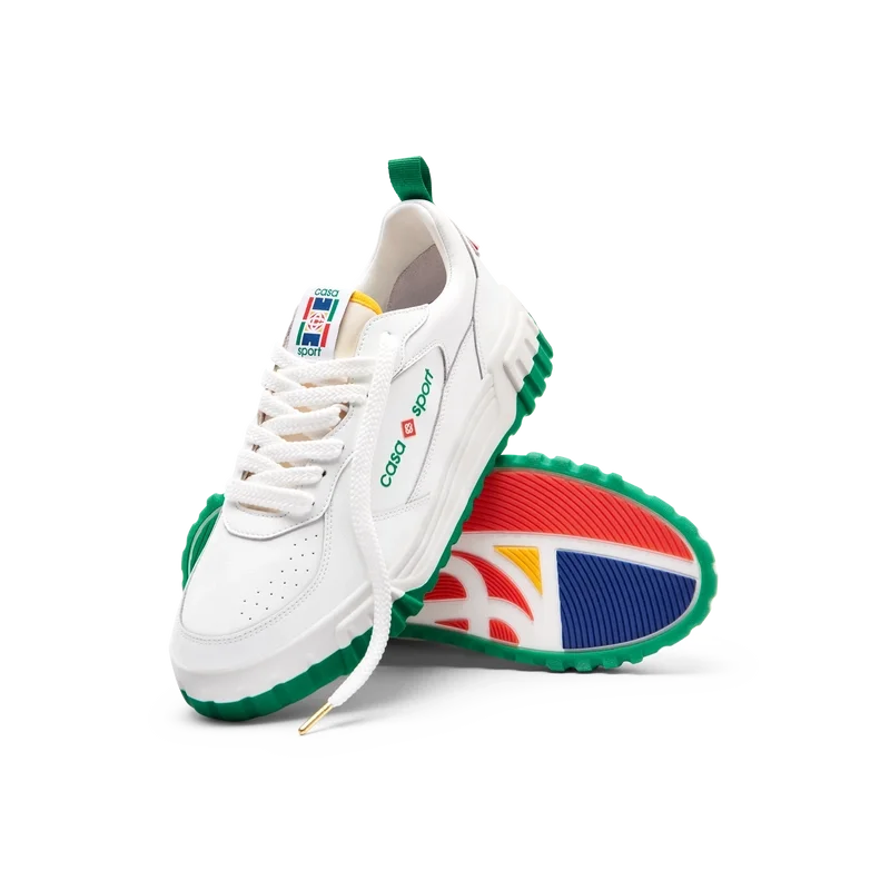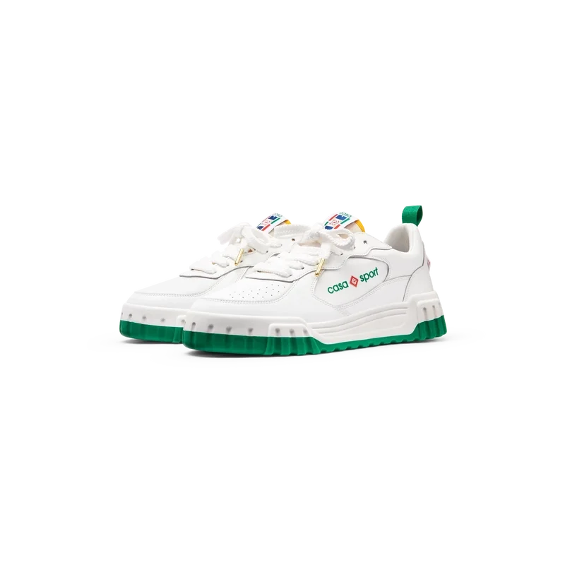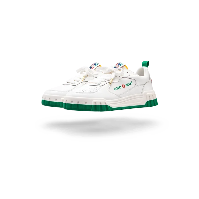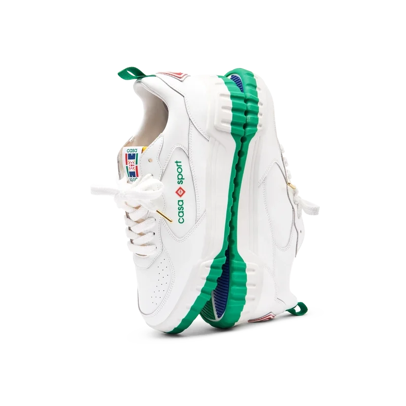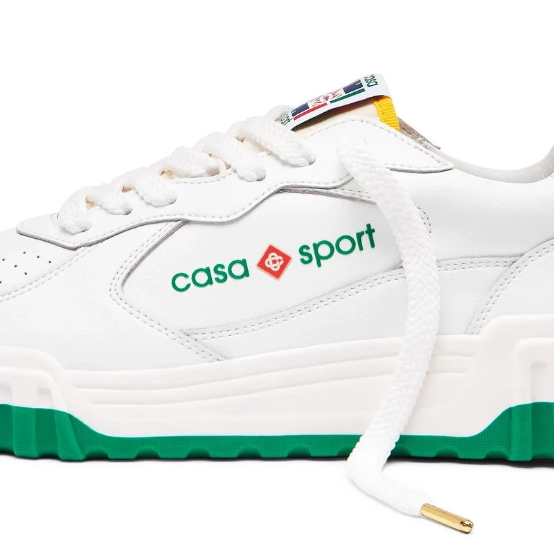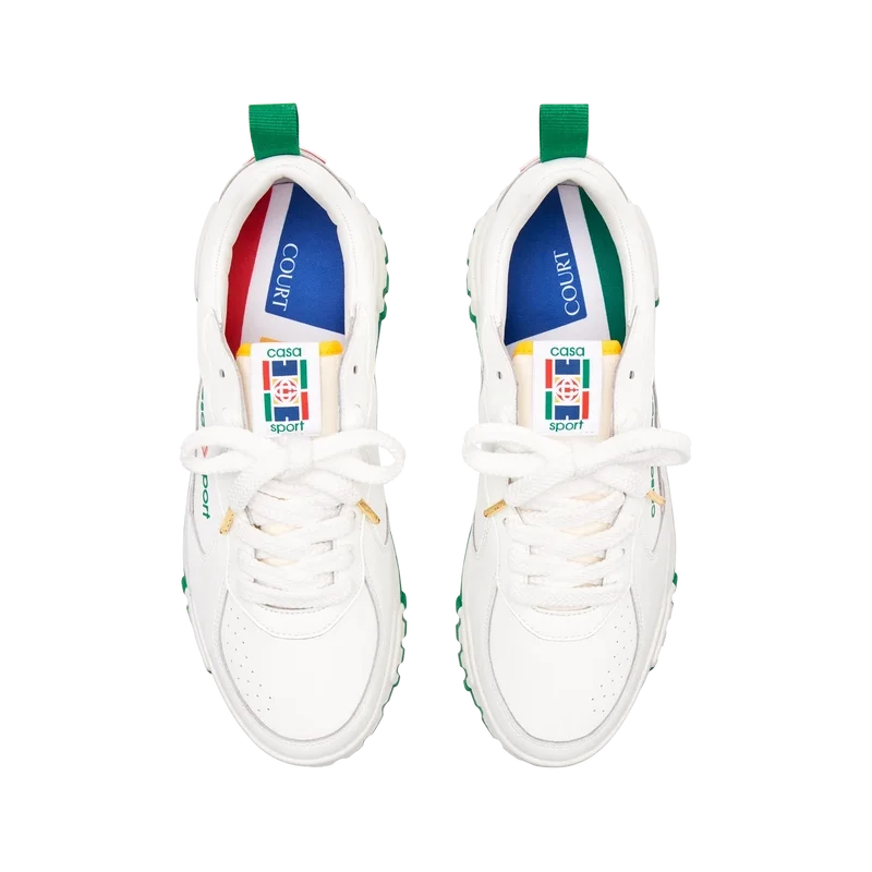 Das Obermaterial der Schuhe zeichnet sich durch integrierte, fließende Panel-Linien aus, die an die ikonischen Silhouetten der 90er Jahre anknüpfen. Das markante Casa Sport-Branding ist durchgehend sichtbar, einschließlich des charakteristischen Diamantmotivs der Marke an der Ferse, des seitlichen Silikon-Wordmark-Panels sowie des gewebten Zungenlabels und der Einlegesohle mit Tennisplatz-Motiv, die dem Schuh seinen Namen „Court“ geben.