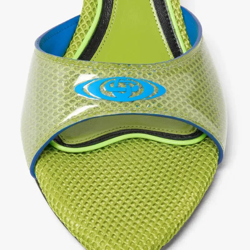 Die grünen Mule-Sandalen mit Absatz sind ein raffiniertes, rücken- und riemenloses Design mit einer eleganten, offenen Zehenpartie. Abgerundet werden sie durch das verzerrte Logo des Hauses auf dem Obermaterial und einen schlanken Kitten-Heel, der den gehobenen Ansatz des Hauses bei Sommerschuhen verkörpert.