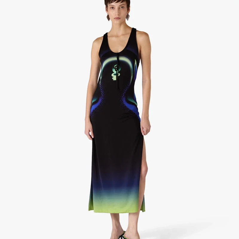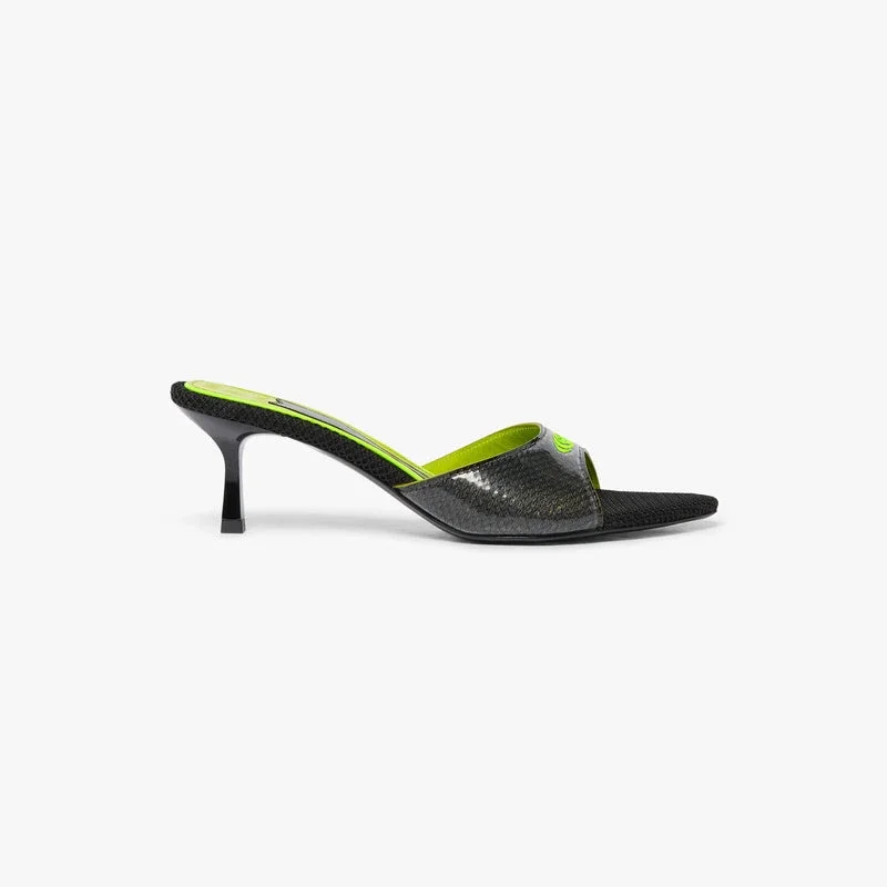 Die schwarzen Mule-Sandalen mit Absatz sind ein raffiniertes, rücken- und riemenloses Design mit einer eleganten, offenen Zehenpartie. Abgerundet durch das Warped-Logo des Hauses auf dem Obermaterial und einen schlanken Kitten-Heel, der den gehobenen Ansatz des Hauses für Sommer-Schuhe verkörpert.
