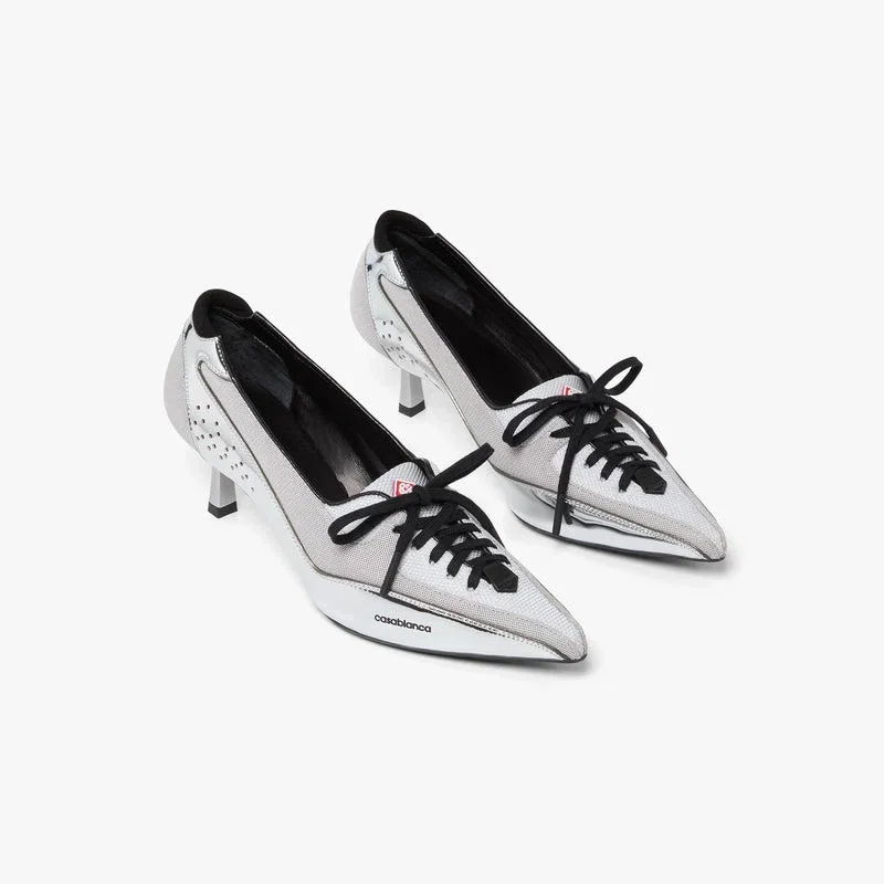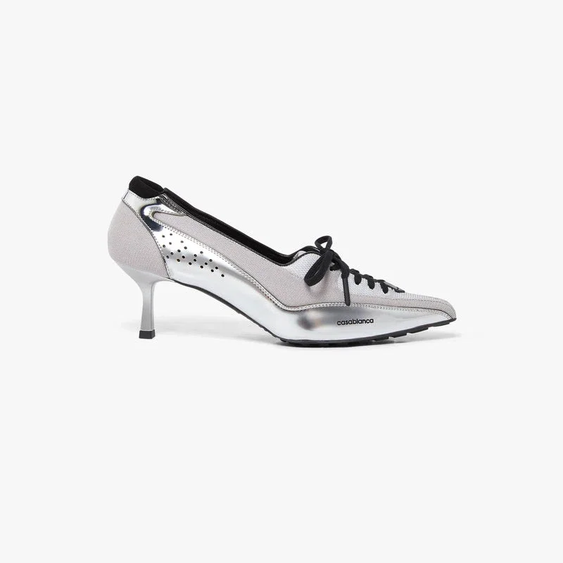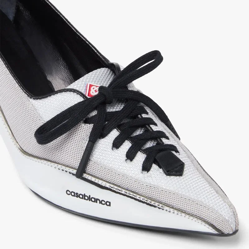Die Sneaker-Pumps mit Absatz aus silbernem Leder zeichnen sich durch ein raffiniertes Design aus, das eine innovative Verschmelzung von Sneaker- und Pump-Silhouetten darstellt. Abgerundet durch einen Schnürverschluss, ein Obermaterial aus Leder und Textil sowie einen eleganten Kitten-Absatz, der den gehobenen Anspruch des Hauses an zeitgenössische Schuhe verkörpert.