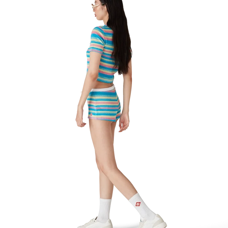Die gestreiften Frottee-Minishorts sind ein kurzes Modell aus Frottee. Sie sind mit einem kontrastierenden elastischen Bund, einem Kordelzugverschluss und dem charakteristischen Rautenlogo des Hauses versehen.