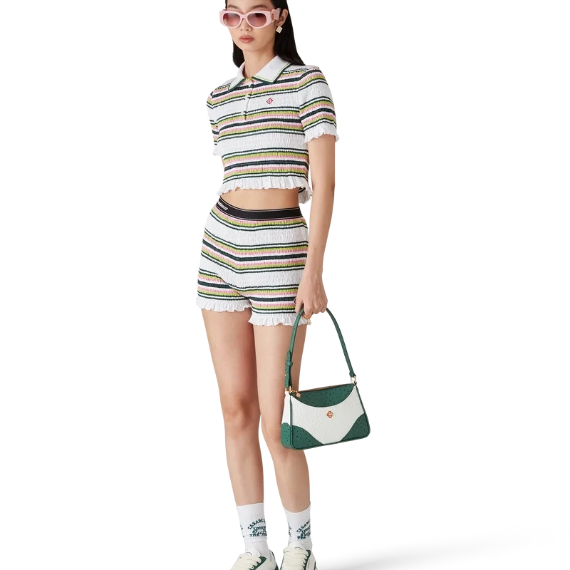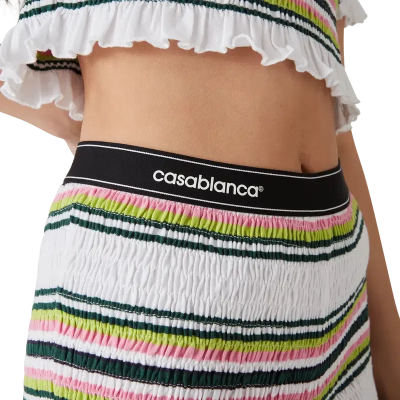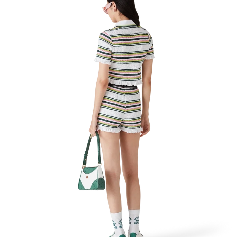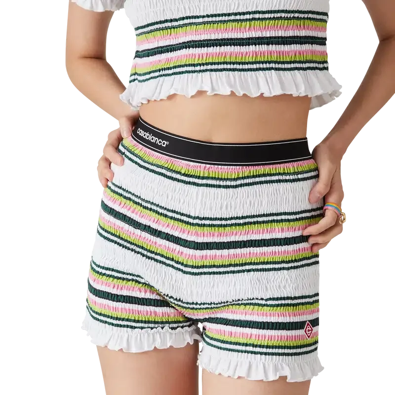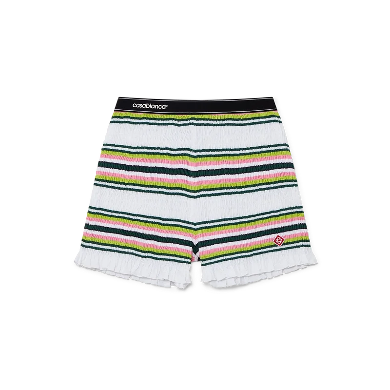 Die „Stripe Shirred Shorts“ sind kurze Shorts aus gerafftem Baumwollstoff, die mit dem charakteristischen Rautenlogo des Hauses verziert sind. Abgerundet werden sie durch einen elastischen Bund mit Casablanca-Logo und Kantenverzierung sowie Rüschen am Saum.