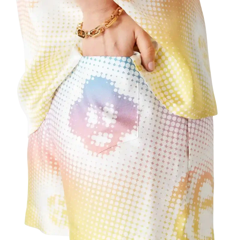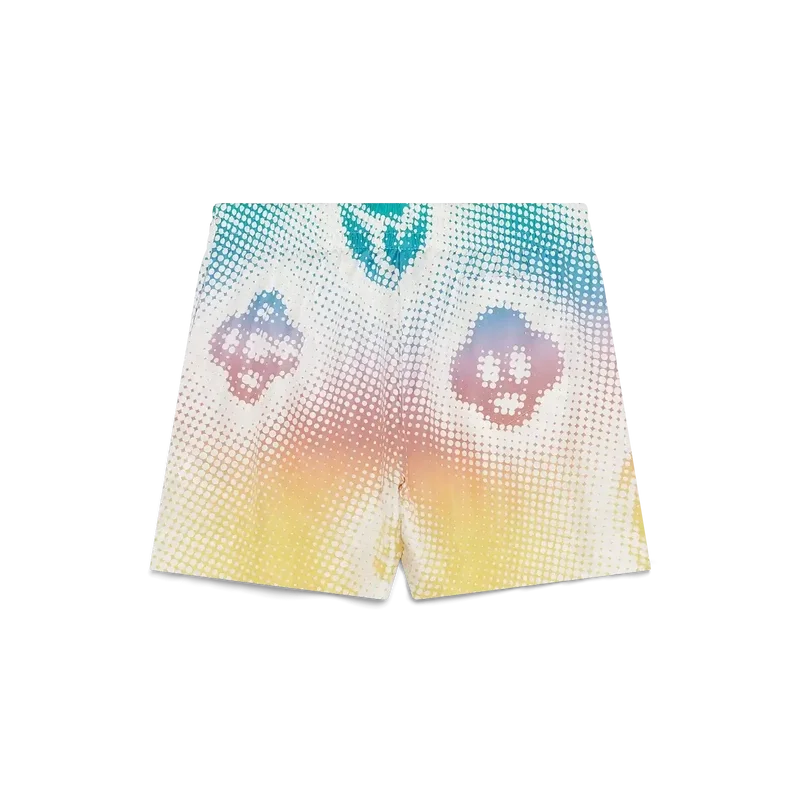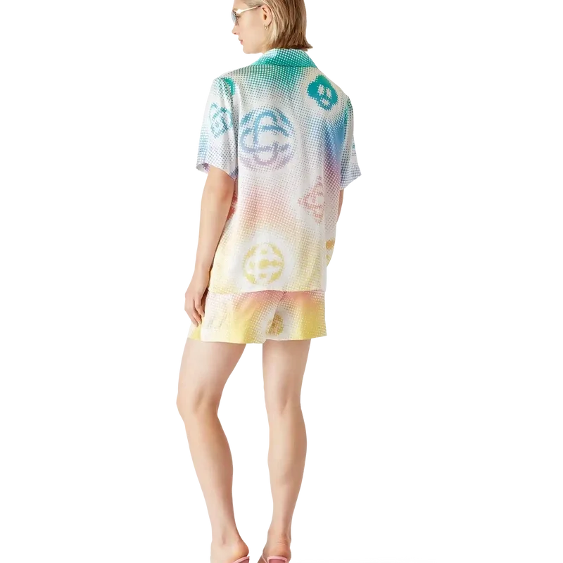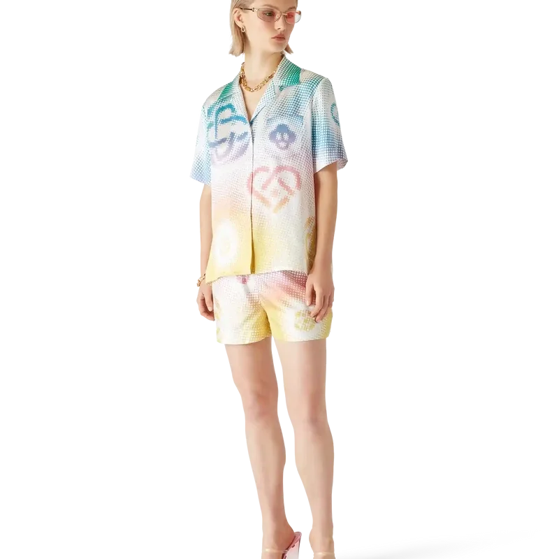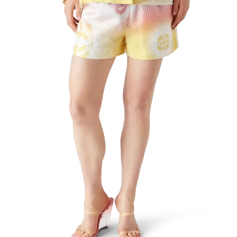 Die Seidenshorts mit Halbton-Logo sind ein durchgehend bedrucktes Design mit Kunstwerken der Monogramme des Hauses, die mittels Airbrush-Technik aufgebracht wurden und auf unseren früheren Experimenten mit dieser Technik aufbauen. Abgerundet durch einen elastischen Bund, eine aufgesetzte Gesäßtasche und seitliche Eingrifftaschen.