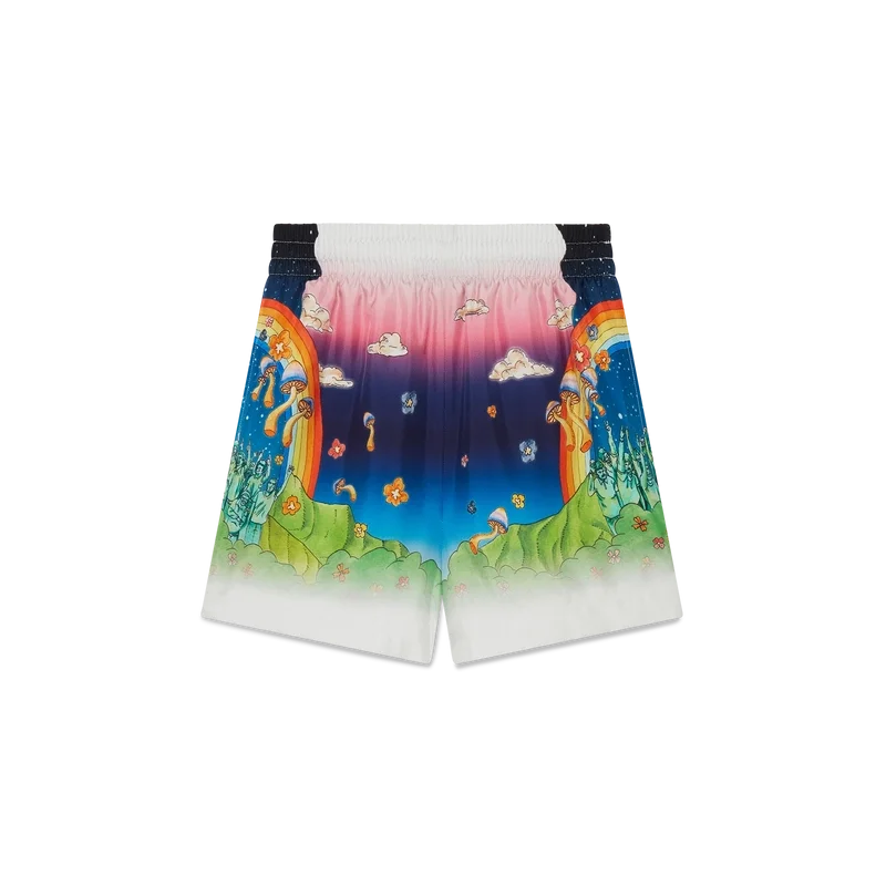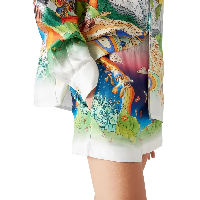 Die La Musique Seidenshorts sind ein durchgehend bedrucktes Design aus Seidentwill mit dem saisonalen Artwork, das eine Ode an Bootsy Collins und ikonische Funk-Platten der 70er Jahre darstellt. Abgerundet durch einen elastischen Bund, ein Futter, Seitentaschen in den Beinen und eine aufgesetzte Gesäßtasche.