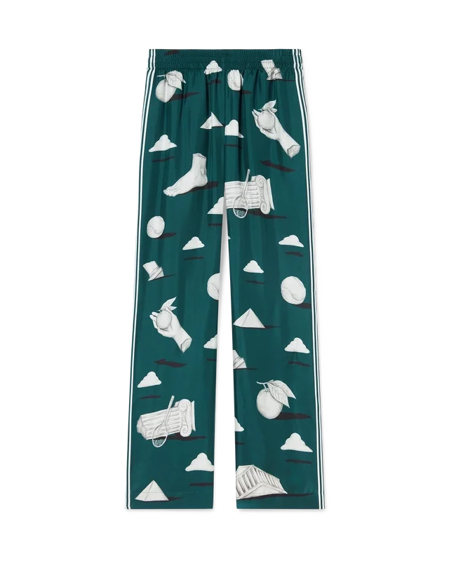 Die Metaphysical Seiden-Hose ist ein durchgehend bedrucktes Design aus Seidentwill, das mit Motiven verziert ist, welche die zentralen Designelemente des Hauses darstellen. Abgerundet wird sie durch einen elastischen Bund mit Kordelzug, seitliche Eingrifftaschen und Streifendetails an den Seiten.