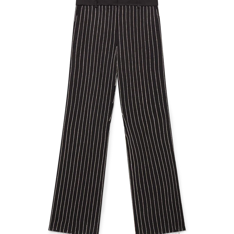 Die mit Kristallen verzierte, maßgeschneiderte Hose hat ein schmales Design, ist aus Seiden-Anzugstoff und Kristallen gefertigt und verfügt über ein Futter aus Baumwollmischung. Abgerundet wird sie durch einen Reißverschluss, Seitentaschen und Gesäßtaschen mit Paspel.