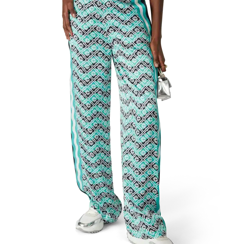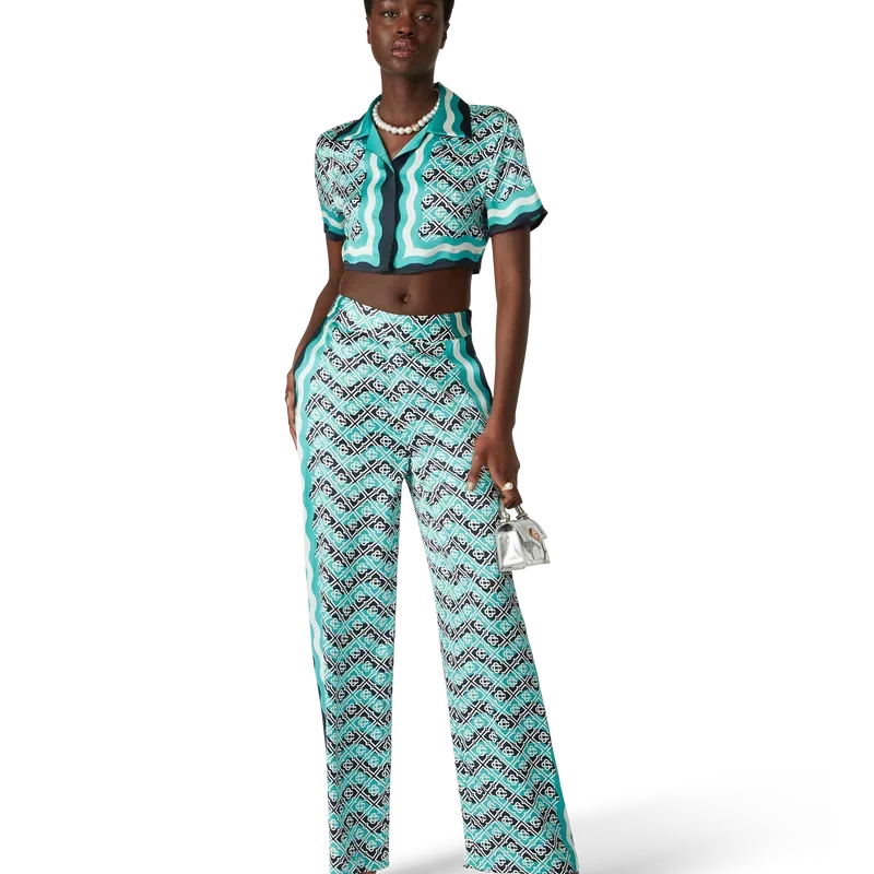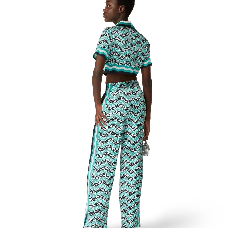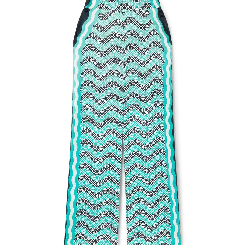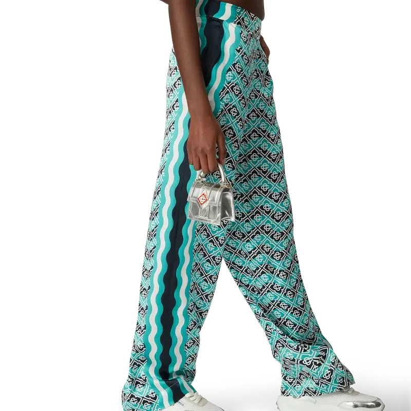Die Monogram Wave Seiden-Hose ist ein Modell mit durchgehendem Druck im charakteristischen Monogram-Muster des Hauses, gefertigt aus Seidensatin. Abgerundet wird sie durch horizontale Streifen im Memphis-Wave-Stil, vertikale Streifen an den Seiten sowie schräge Seitentaschen.