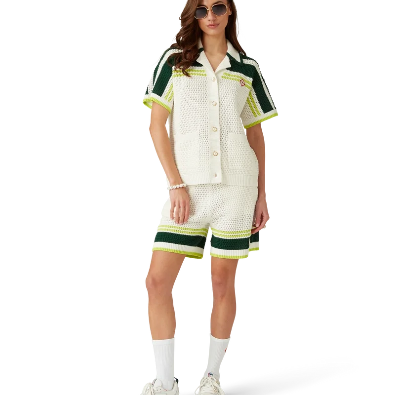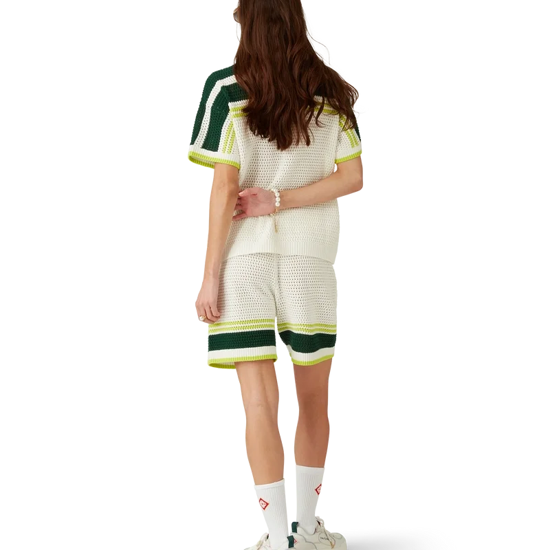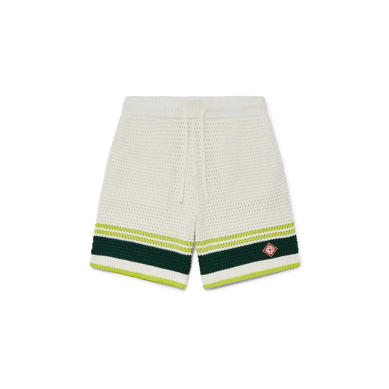 Die Tennis-Crochet-Shorts sind ein weich strukturiertes Design aus gestricktem Baumwollstoff mit dem charakteristischen Rautenlogo des Hauses. Mit geripptem, elastischem Bund mit Kordelzug, Seitentaschen und kontrastierenden Streifen an den Beinen.