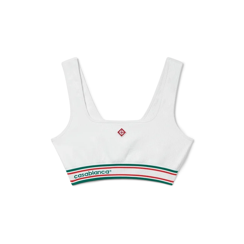 Die nahtlose Bralette ist ein stromlinienförmiges, von Sportbekleidung inspiriertes Design mit dem charakteristischen Tennisstreifen-Design, Casablanca-Branding und einem Diamant-Logo-Patch. Hergestellt aus einem nahtlosen Stretchstoff, bietet sie eine raffinierte Silhouette mit minimalistischer Konstruktion für einen eleganten Look. Abgerundet durch ein elastisches Unterband, Träger und einen U-Ausschnitt.