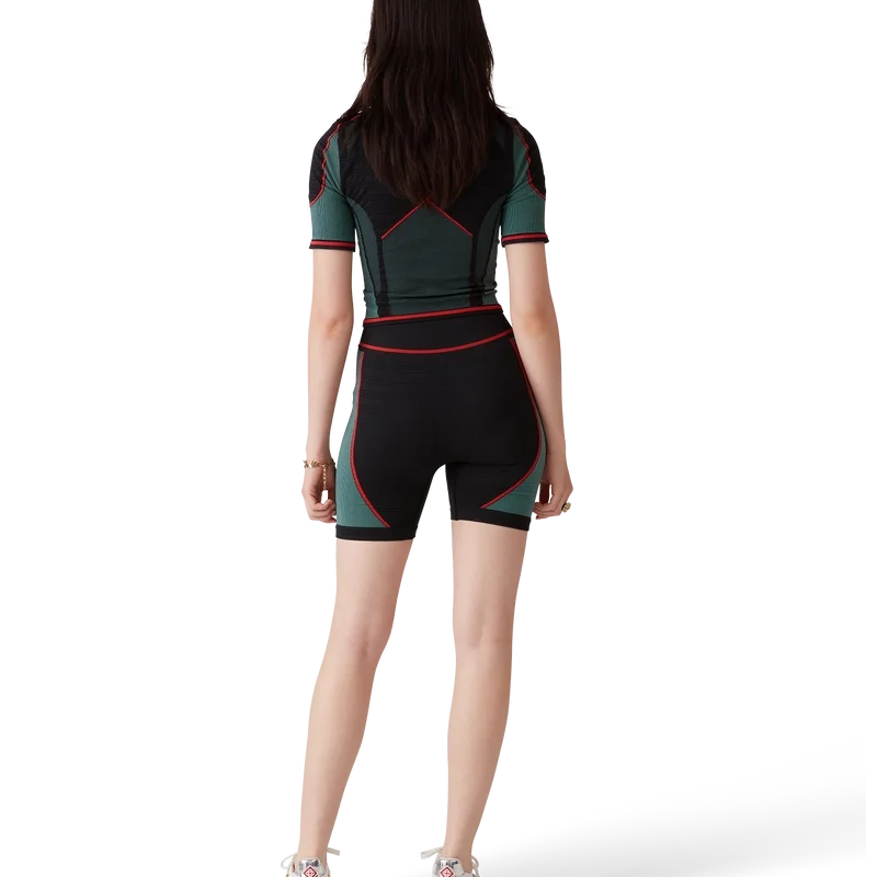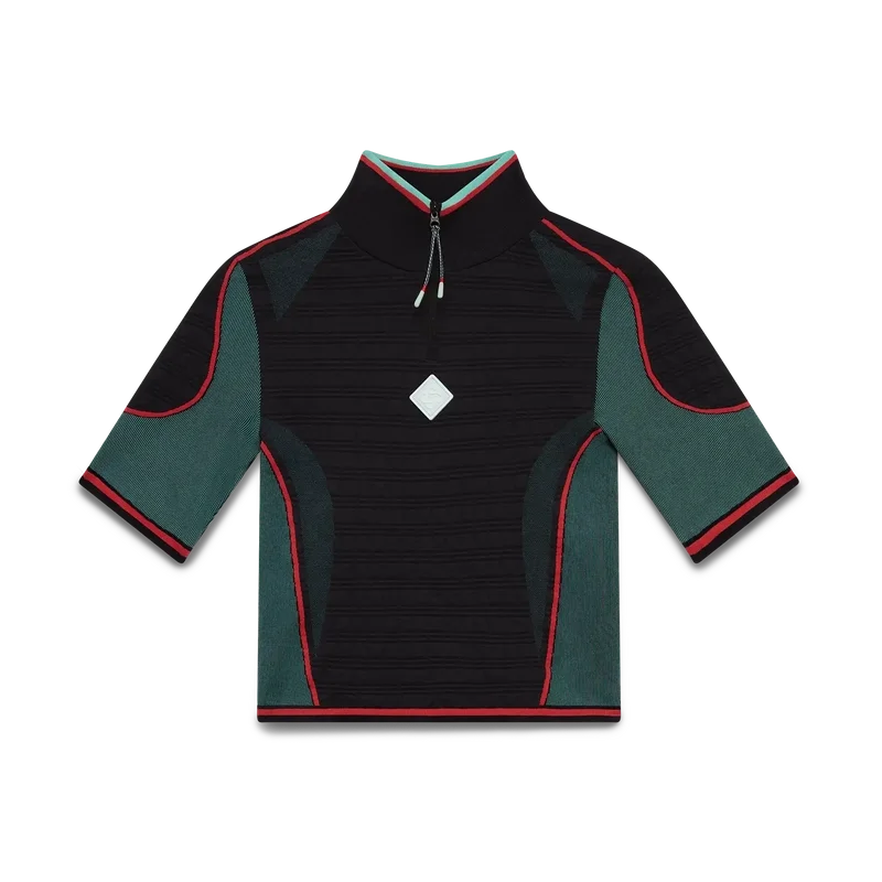 Das nahtlose Hemd mit halbem Reißverschluss ist ein kurzärmeliges, von Sportbekleidung inspiriertes Design aus einem nahtlosen, gerippten Stretchstoff. Es verfügt über einen Reißverschluss, einen Polokragen sowie das Diamant-Logo des Hauses und Einsatze.