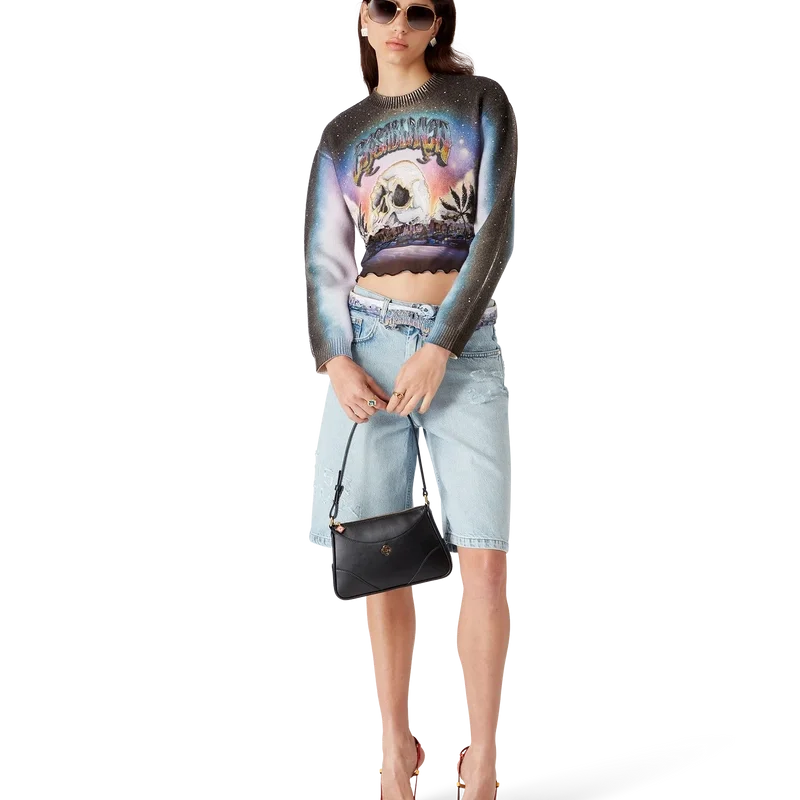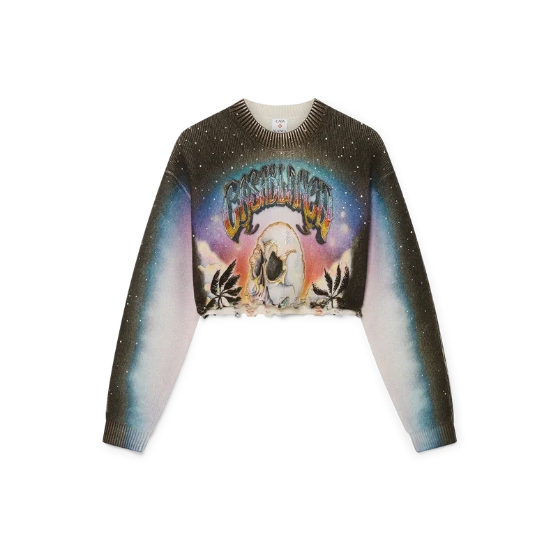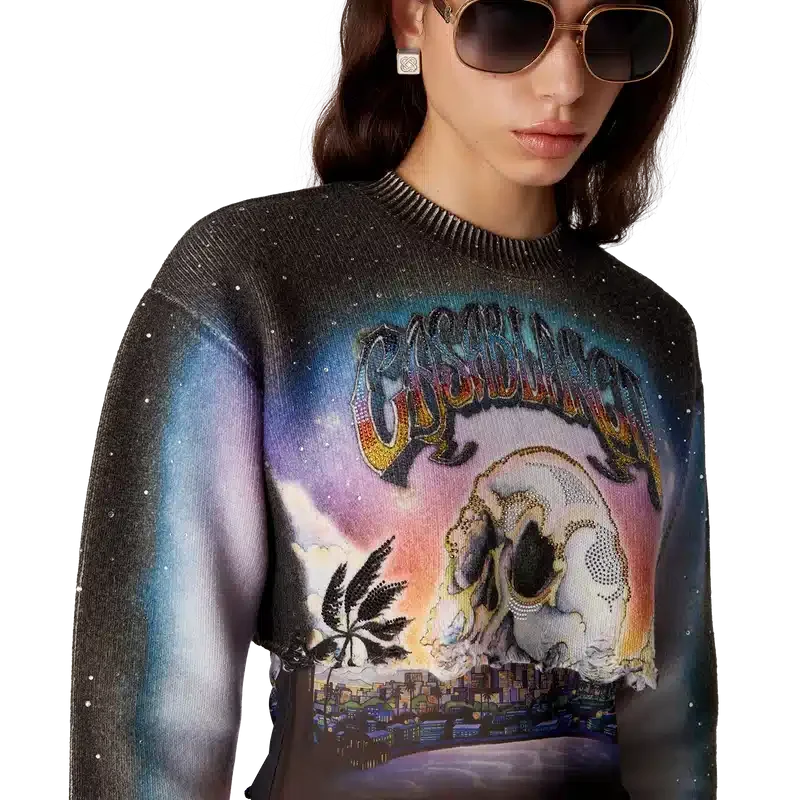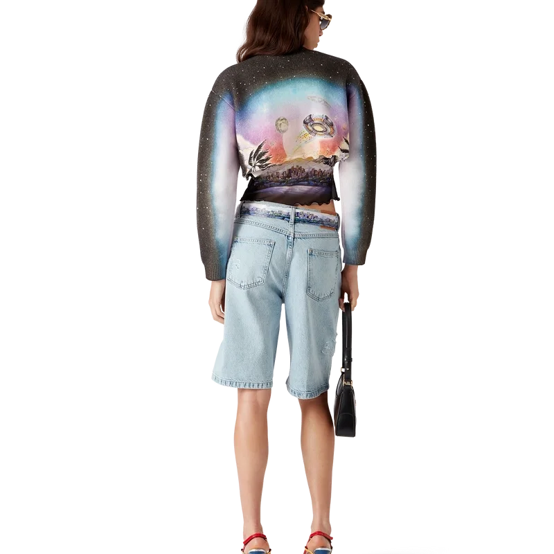Der La Pramonition Cashmere Blend Cropped Jumper ist ein kurz geschnittener Langarmpullover aus bedrucktem Wollstoff mit dem Artwork der Saison, inspiriert von einer unheimlichen Vision der Skyline von La bei Nacht, mit UFO-Elementen, die an Vintage-Sci-Fi-Inspirationen anknüpfen. Abgerundet durch einen klassischen gerippten Rundhalsausschnitt und gerippte Bündchen.