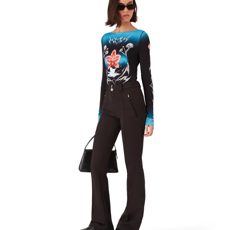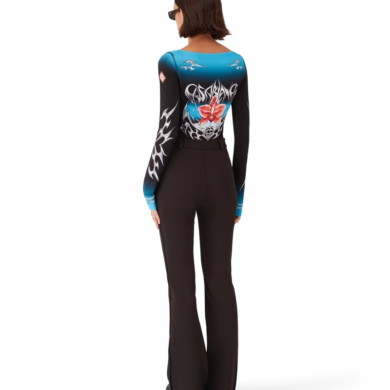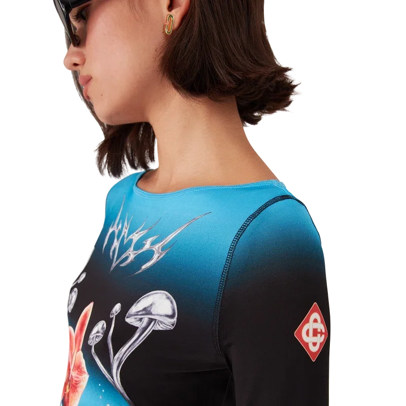 Das Blades Langarm-Oberteil ist ein bedrucktes Design mit dem Blades-Motiv dieser Saison, das mit dem Kontrast zwischen zwei gegensätzlichen Empfindungen spielt – der Schärfe der Klinge und dem kalten, silbernen Chrom, kontrastiert mit der Wärme der Natur, wie den kräftigen Rosa- und Rottönen einer Orchideenblüte. Die Wassertröpfchen verleihen dem Design eine frische, klare Note. Abgerundet wird das Oberteil durch einen U-Boot-Ausschnitt, gestreifte Bündchen und das charakteristische Rautenlogo des Hauses auf den Ärmeln.