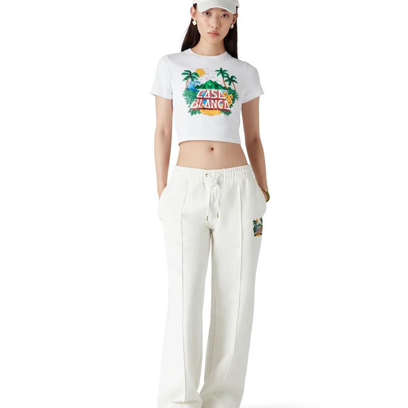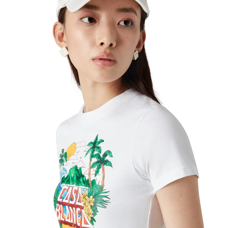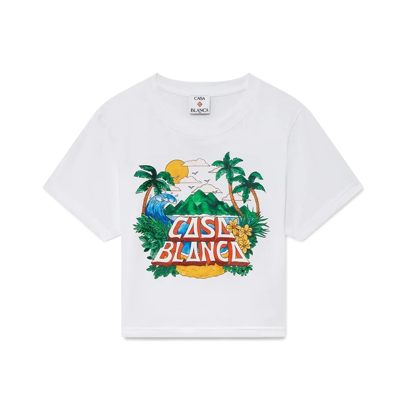 Das Casa Beach Wave Cropped T-Shirt ist ein kurzärmeliges, bedrucktes Modell aus Baumwollstoff mit einem charakteristischen Motiv, das von einem Souvenir-T-Shirt inspiriert ist, wie man es im Strandurlaub kaufen könnte. Es verfügt über einen klassischen Rundhalsausschnitt und ist so geschnitten, dass es oberhalb des Bauchnabels endet.