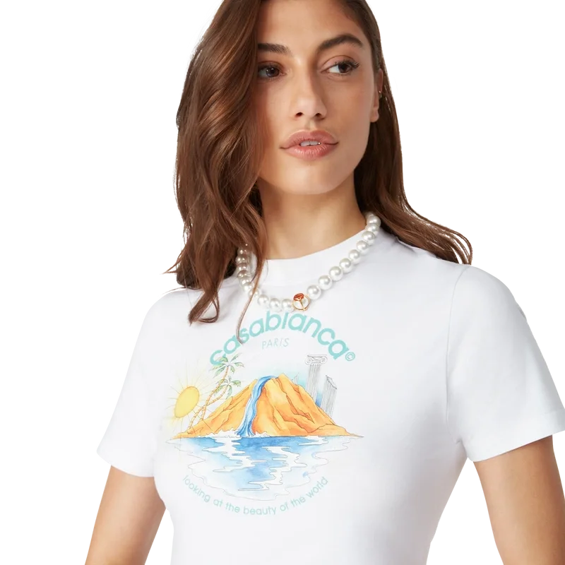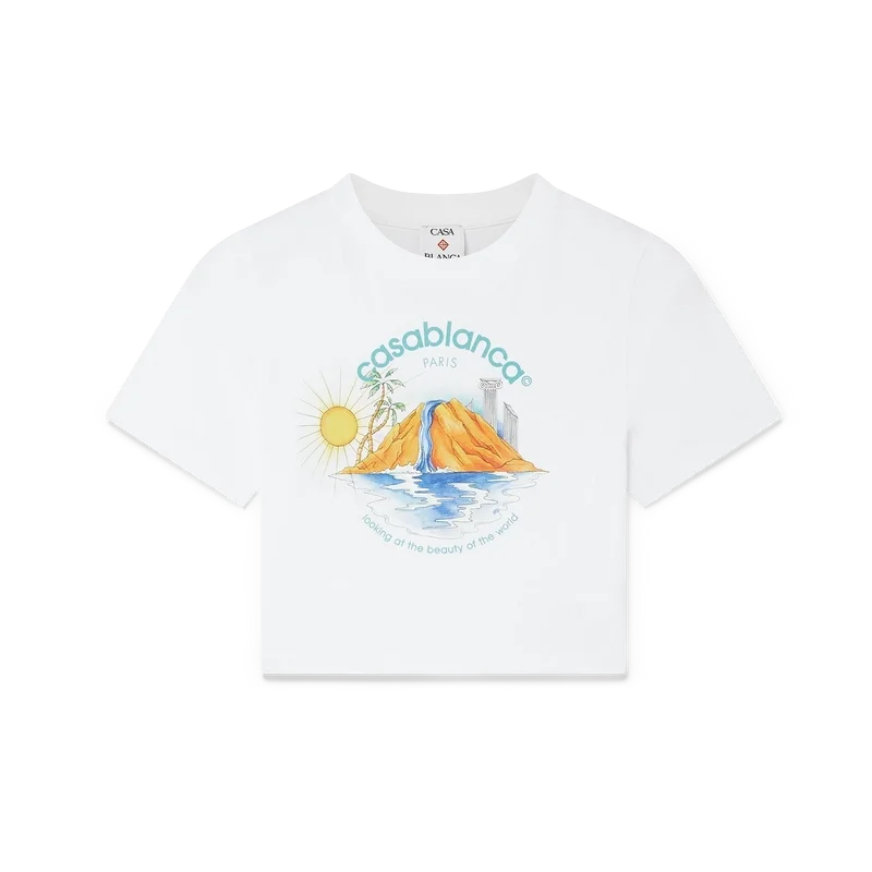 Das Oasis Cropped T-Shirt ist ein kurzärmeliges, bedrucktes Modell aus Bio-Baumwolle, das mit dem saisonalen Artwork des Hauses mit Designelementen aus Natur, Architektur und Tennis verziert ist. Abgerundet durch einen klassischen Rundhalsausschnitt. Entworfen, um oberhalb des Bauchnabels zu sitzen.