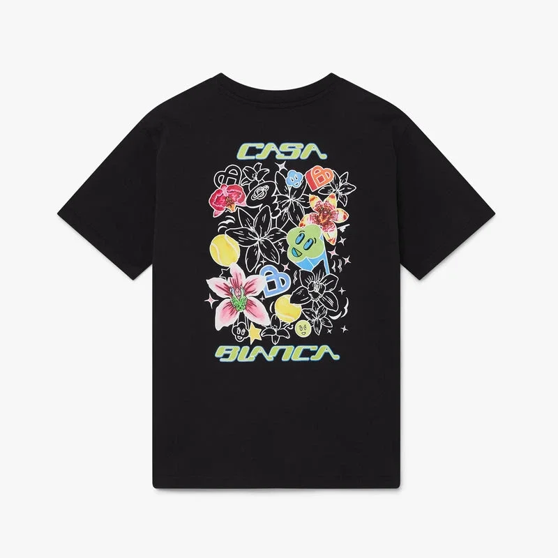Das schwarze Graffiti-Short-T-Shirt mit kurzen Ärmeln besticht durch ein raffiniertes Design mit dem Graffiti-Rahmenmotiv der Saison, das die Ikonografie und Designelemente der neuen Saison widerspiegelt, darunter Interpretationen des Logos, des Smileys und der Orchideenblüte. Abgerundet wird das Design durch einen Rundhalsausschnitt und eine lockere Silhouette.