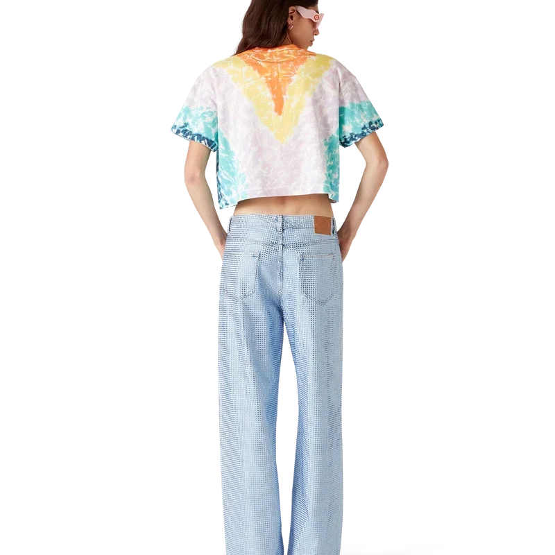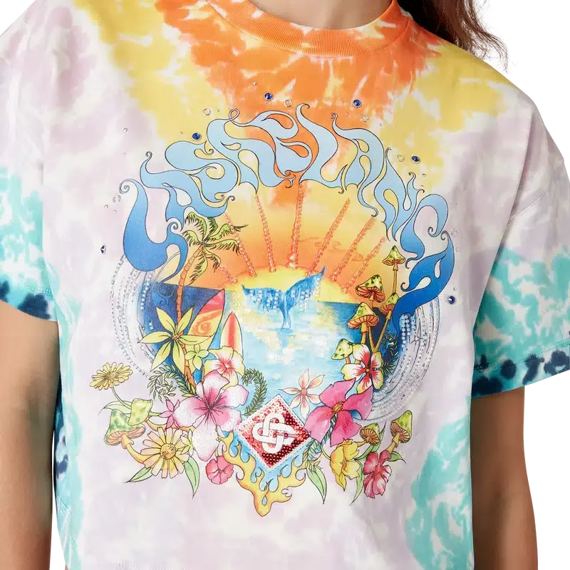 Das Surf Trip Tie-Dye-T-Shirt ist ein bedrucktes Kurzarm-Modell aus Bio-Baumwolle mit saisonalen Motiven, die von der Vintage-Surfkultur in Malibu inspiriert sind. Es verwendet Typografie aus dieser Ära auf einem Tie-Dye-Hintergrund, der an die Hippie-Kultur erinnert. Abgerundet wird das Design durch einen klassischen Rundhalsausschnitt mit Rippstrick. Entworfen für eine Passform oberhalb des Bauchnabels.