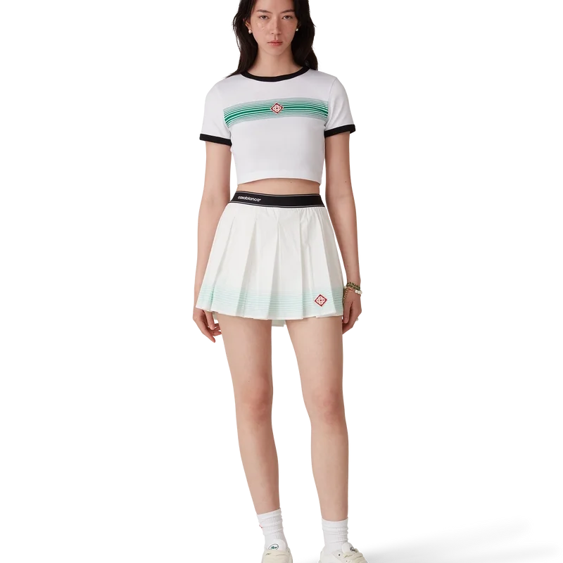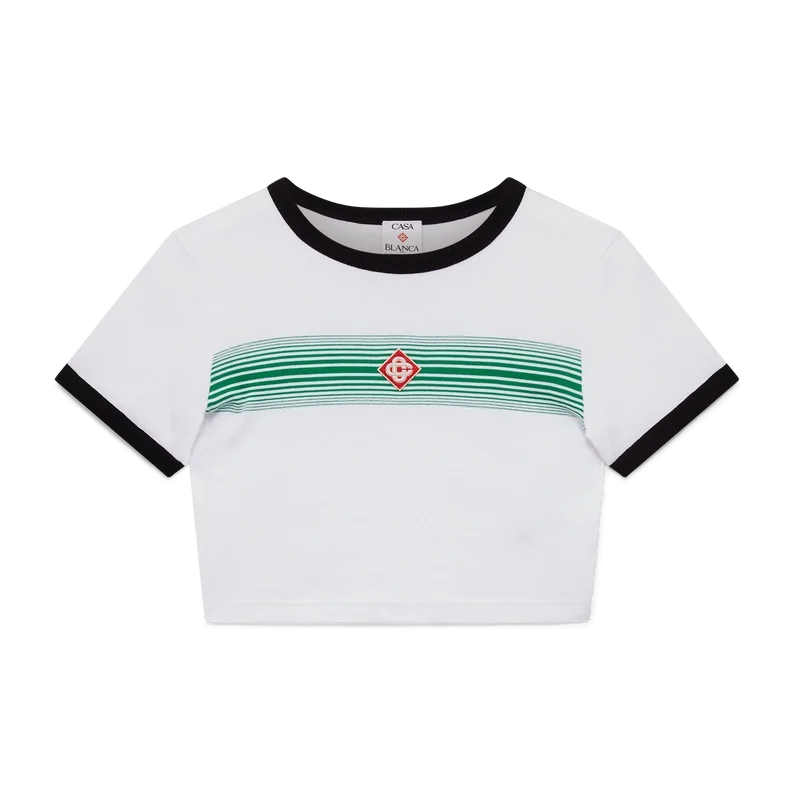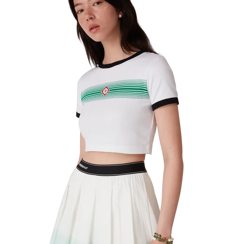 Das T-Shirt mit gestreiften Rippbündchen und Farbverlauf ist ein figurbetontes Design mit dem aufgesetzten Diamant-Logo des Hauses. Es ist aus Baumwollstoff gefertigt und verfügt über einen klassischen Rundhalsausschnitt sowie kontrastierende Rippbündchen an Kragen und Ärmeln.