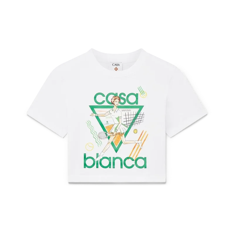 Das Tennis Girl Baby-T-Shirt ist ein kurzärmeliges, bedrucktes Modell aus einem Baumwollmischgewebe, das mit dem saisonalen Design des Hauses verziert ist, inspiriert von der fortwährenden Auseinandersetzung mit der klassischen Schönheit und dem zeitgenössischen Charme des antiken Griechenlands. Abgerundet durch einen klassischen Rundhalsausschnitt – geschnitten, um oberhalb des Bauchnabels zu sitzen.