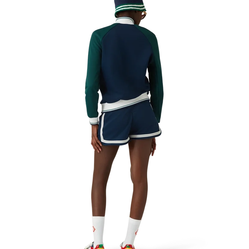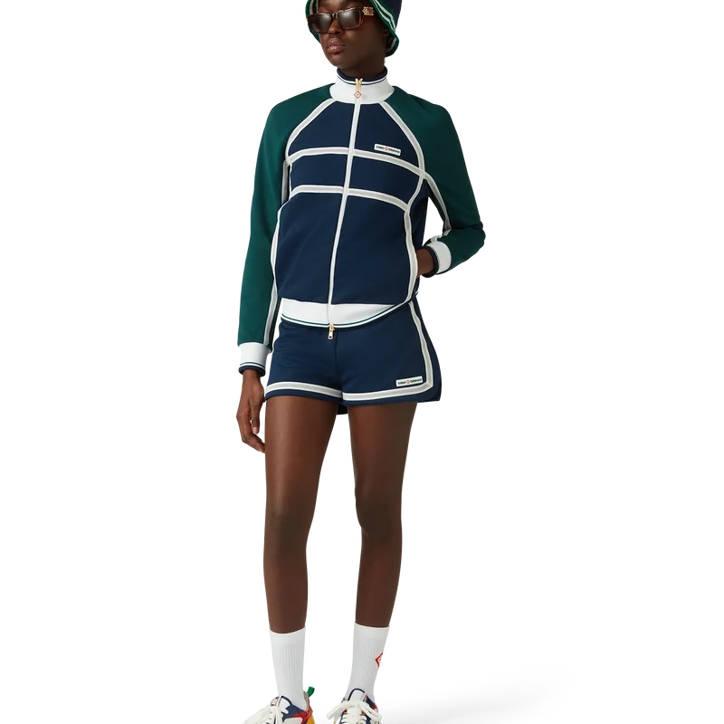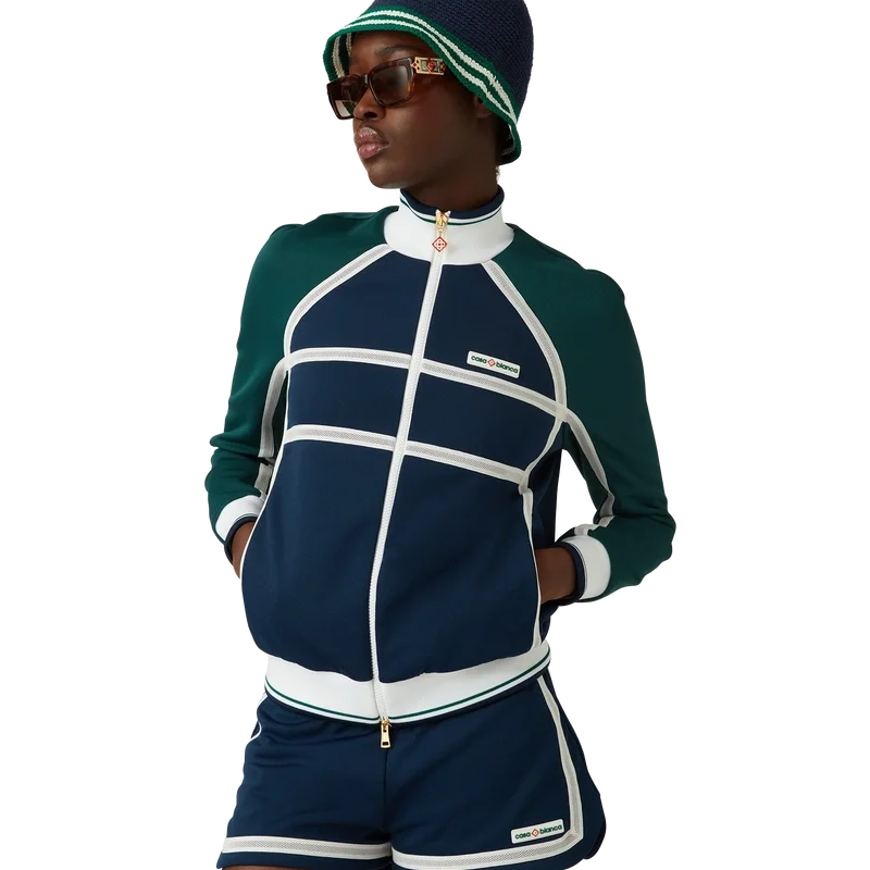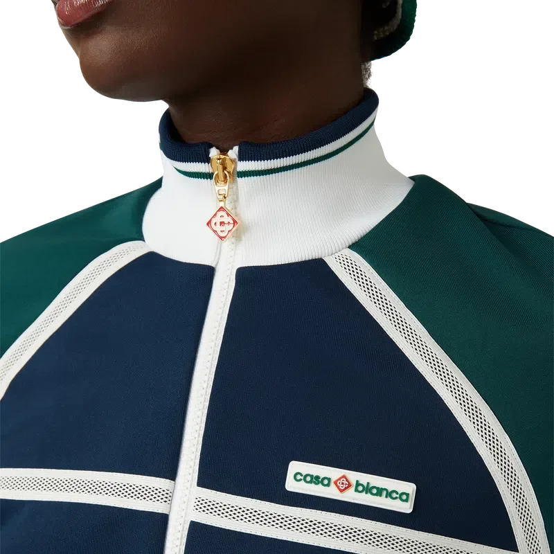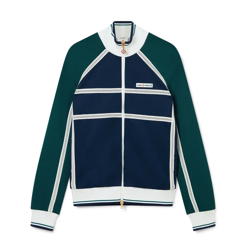 Die Mesh Tape Track Jacket ist ein von Sportbekleidung inspiriertes Design aus Trikotstoff. Mit Reißverschluss, Einsätzen mit weißen Paspeldetails, geripptem Kragen, Ärmelbündchen und Saum mit Streifendetails, Seitentaschen, Mesh-Band-Detail und dem charakteristischen Casablanca-Logo des Hauses.