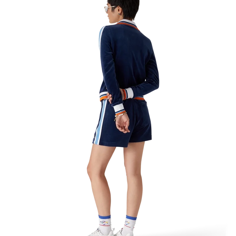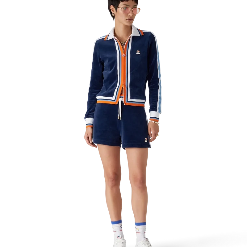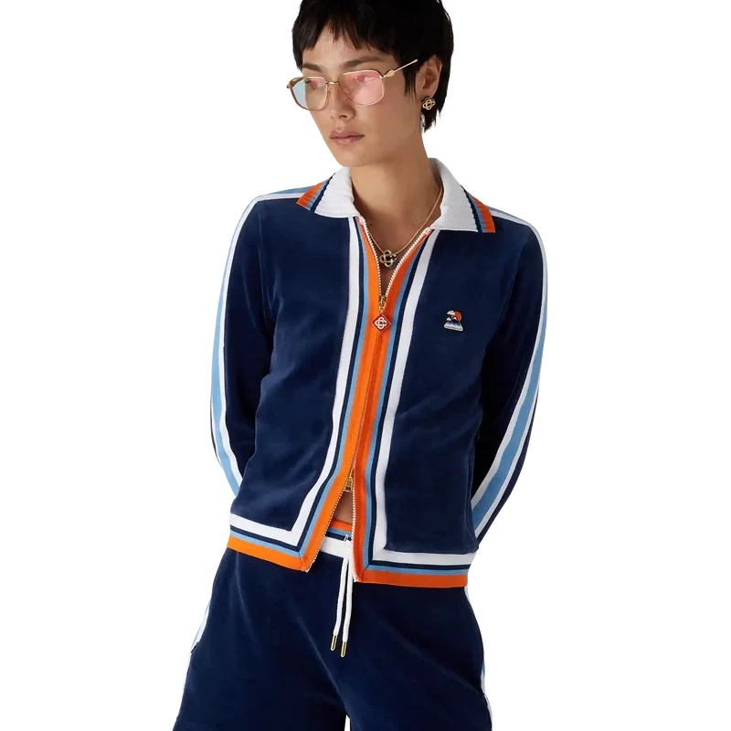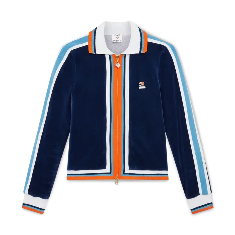 Die Velour Montagne Trainingsjacke ist ein Sportbekleidungsmodell aus Veloursstoff. Mit Reißverschluss, kontrastierendem Rippstrickkragen, Ärmelbündchen, Saum und Knopfleiste mit Streifendetails sowie Eingrifftaschen.