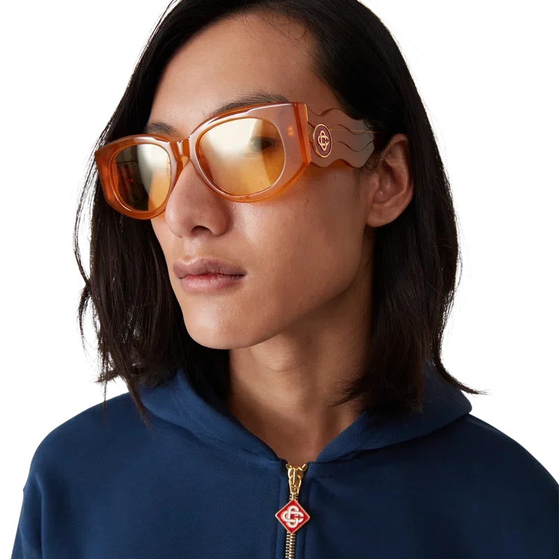 Die markante orangefarbene Acetatrahmenkonstruktion der Memphis-Sonnenbrille prägt diese rechteckige Sonnenbrille. Hier ist das charakteristische Casablanca-Diamond Monogram-Logo an den Bügeln angebracht. Die Verlaufsgläser bieten 100 % UV-Schutz und das Modell wird komplett mit einer Casablanca-Box, einem Reinigungstuch und einem Garantieschein geliefert.