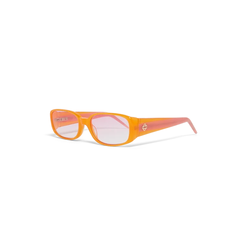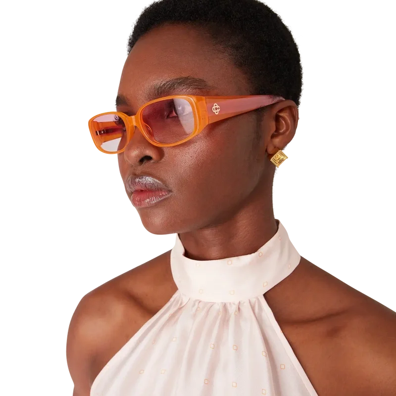 Die rosa-orangefarbene Slim-Sonnenbrille hat ein ovales Design und besteht aus einem Acetatrahmen mit dem charakteristischen vergoldeten, ineinander verschlungenen CC-Logo an den Bügeln. Die rosa Gläser bieten UV-Schutz und das Modell wird komplett mit einer Geschenkbox, einem Reinigungstuch, einer Garantie und einer Broschüre mit Produktdetails geliefert.