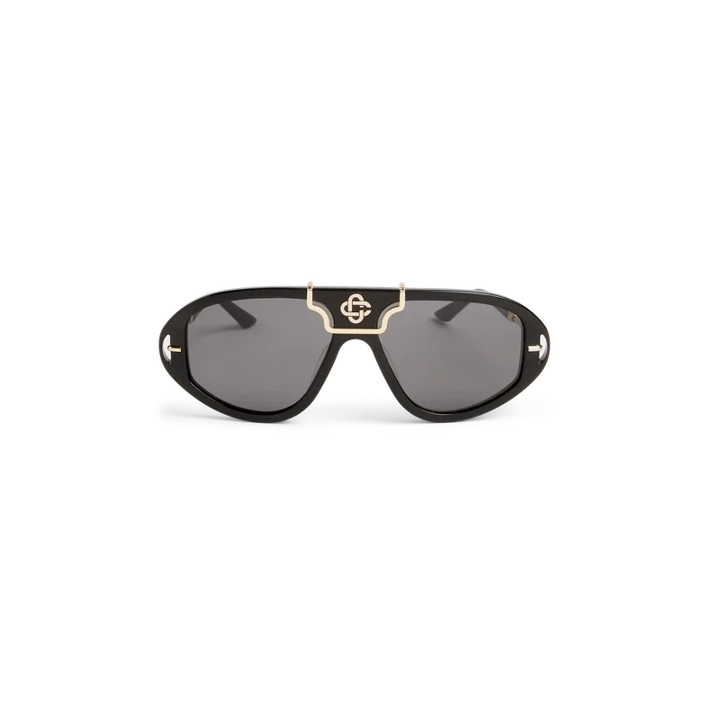 Die markante schwarz-goldene Acetatstruktur der Hacienda-Sonnenbrille prägt diese rechteckige Sonnenbrille. Hier befindet sich das charakteristische Casablanca-Diamond Monogram-Logo auf dem Nasensteg. Die grauen Gläser bieten 100 % UV-Schutz und das Set wird durch eine Casablanca-Box, ein Reinigungstuch und ein Garantiebuchlet vervollständigt.