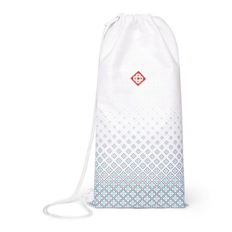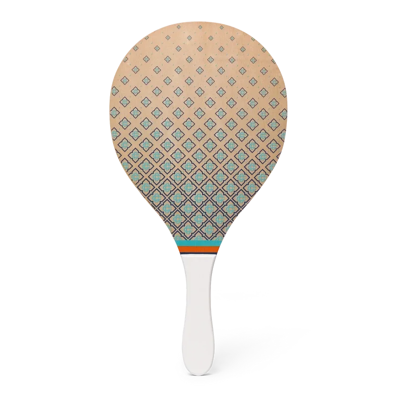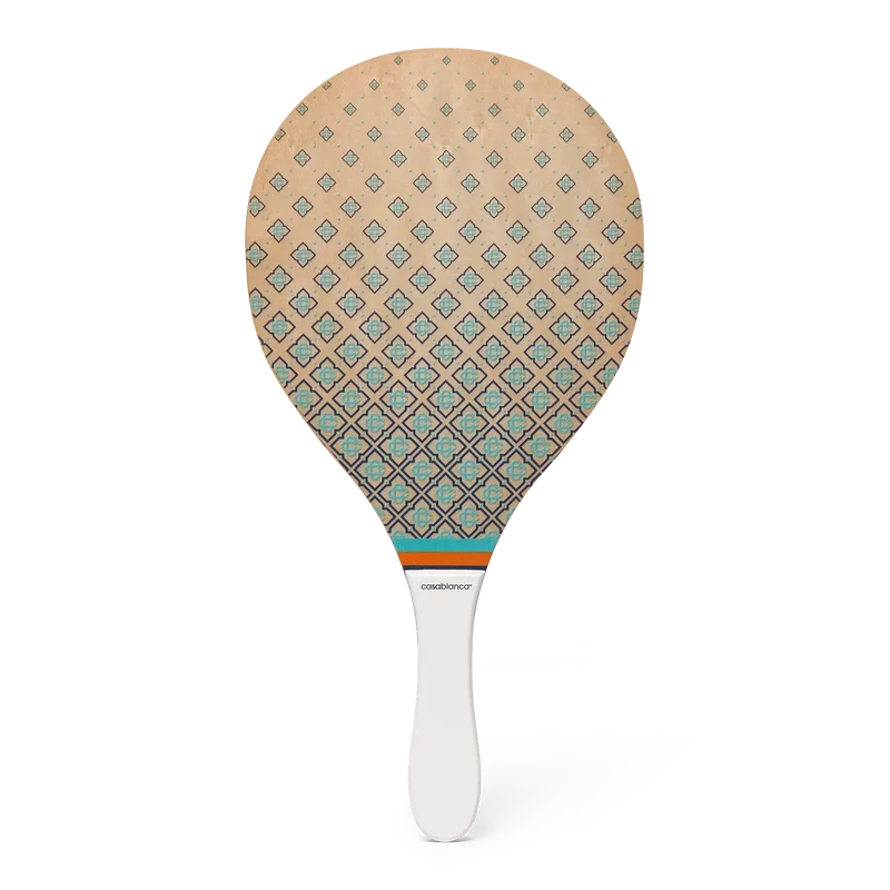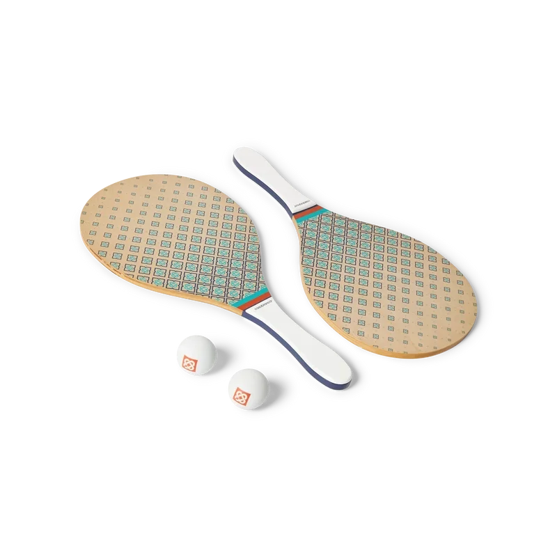 Die Beach Bats und Bälle sind aus Sperrholz gefertigt und mit Ölfarbe bemalt und tragen auf den Schlagflächen den Degrade-Monogramm-Print des Hauses. Abgerundet durch gestreifte Farbakzente in Mint, Orange und Marineblau am Griff sowie einen weißen Griff und zwei Gummibälle mit Markenlogo. Maße: 19,2 cm (Querdurch die Vorderseite) x 39 cm (von der Oberkante der Vorderseite bis zur Unterseite des Griffs) und wird mit einer eigenen Aufbewahrungstasche mit Markenlogo und Trageriemen geliefert.