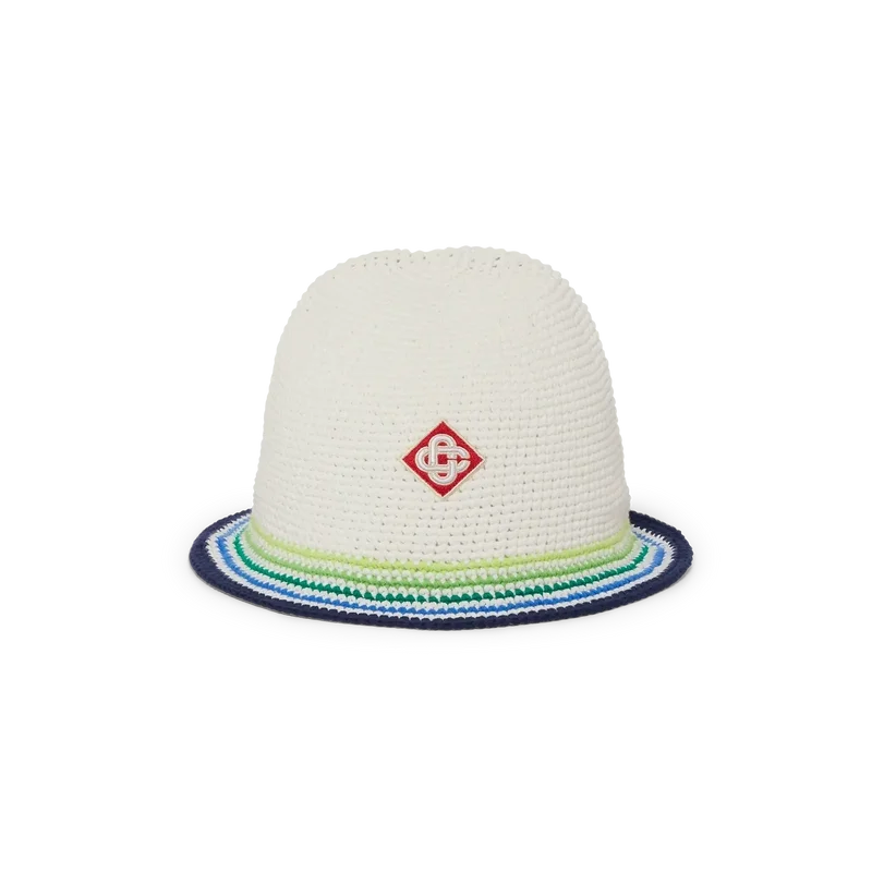 Die Beach Club Cap ist eine raffinierte Mütze im Bucket-Stil aus gehäkelter Baumwolle mit dem charakteristischen Diamant-Logo des Hauses in der Mitte. Abgerundet durch eine blau, grün, gelb und weiß gestreifte Krempe.
