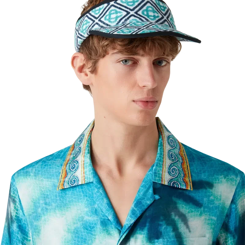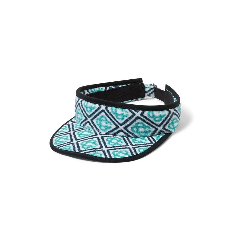 Die Monogram-Frottee-Schirmmütze ist ein bedrucktes Design aus einem Baumwollmischgewebe. Mit Schirm, verstellbarer Schnalle und marineblauen Zierdetails.