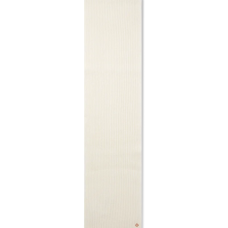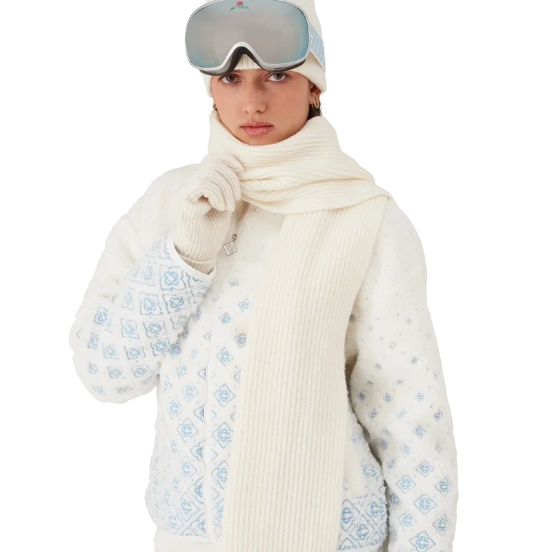 Der Skischal besticht durch ein raffiniertes Design aus weißer, gerippter Wollstrickware, inspiriert vom unberührten Pulverschnee, der die ländlichen Dörfer Hokkaidos in Japan bedeckt. Das Design erinnert an frostbedeckte Bambushaine und Bauernhäuser in alpinen Tälern und verkörpert mit seiner präzisen Verarbeitung die Apras-Sport-Kodizes des Hauses.