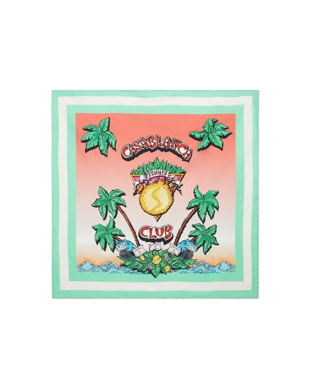 Der Tennis Club Seidenschal in mittlerer Größe ist ein bedrucktes Design aus Seidentwill, das das saisonale Artwork des Hauses zeigt, neu interpretiert als Surf-Motiv im Stil einer mit Markern gezeichneten grafischen Skizze. Abgerundet durch einen grün-weiß gestreiften Rand.