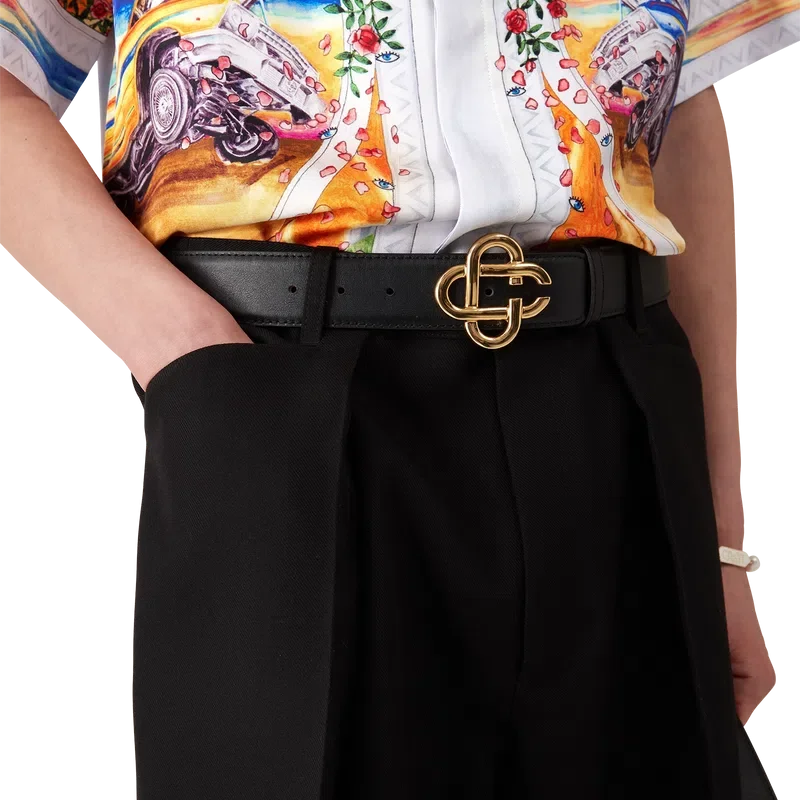 Der schwarze Gürtel mit Cc-Logo verfügt über einen Riemen aus italienischem Ziegenleder. Abgerundet wird er durch die für das Haus charakteristische, ineinander verschlungene Cc-Schnalle aus vergoldetem Messing.
