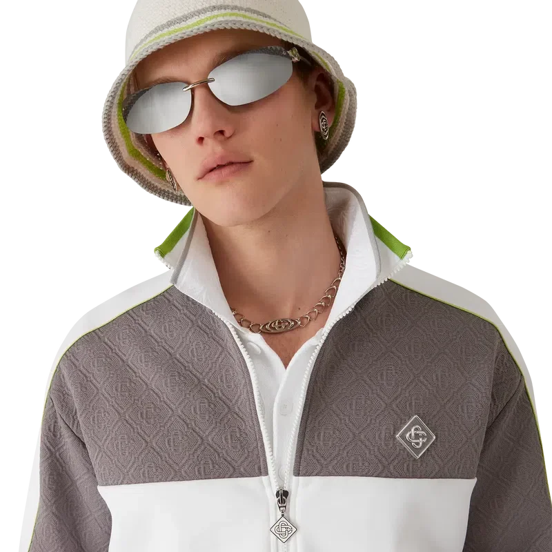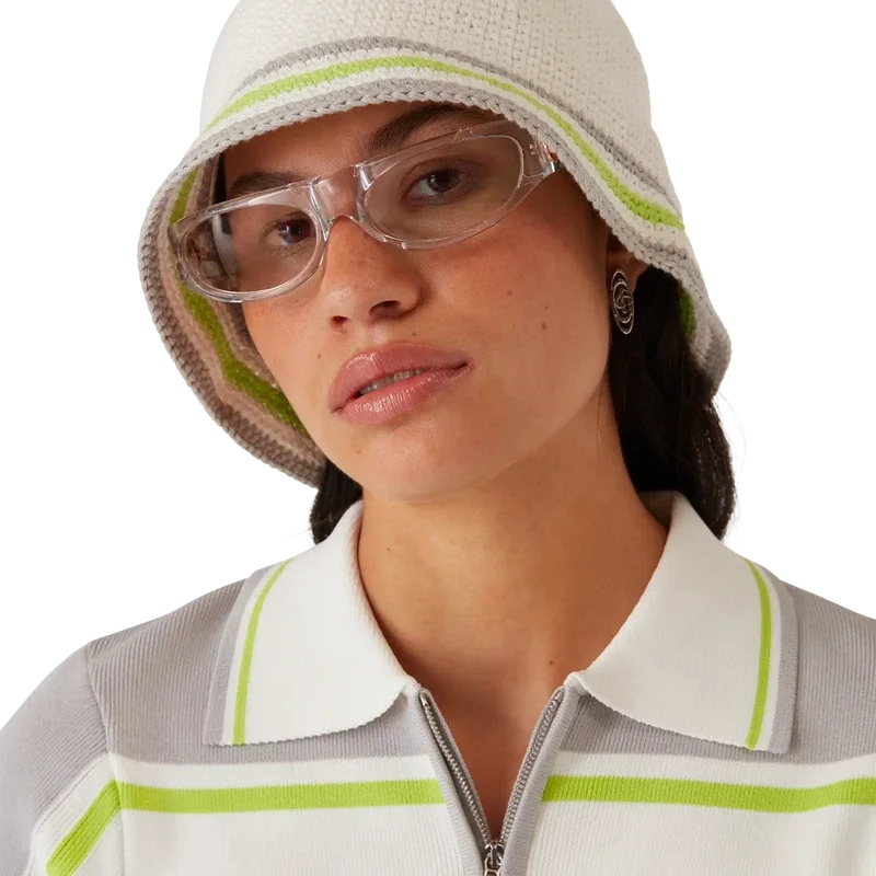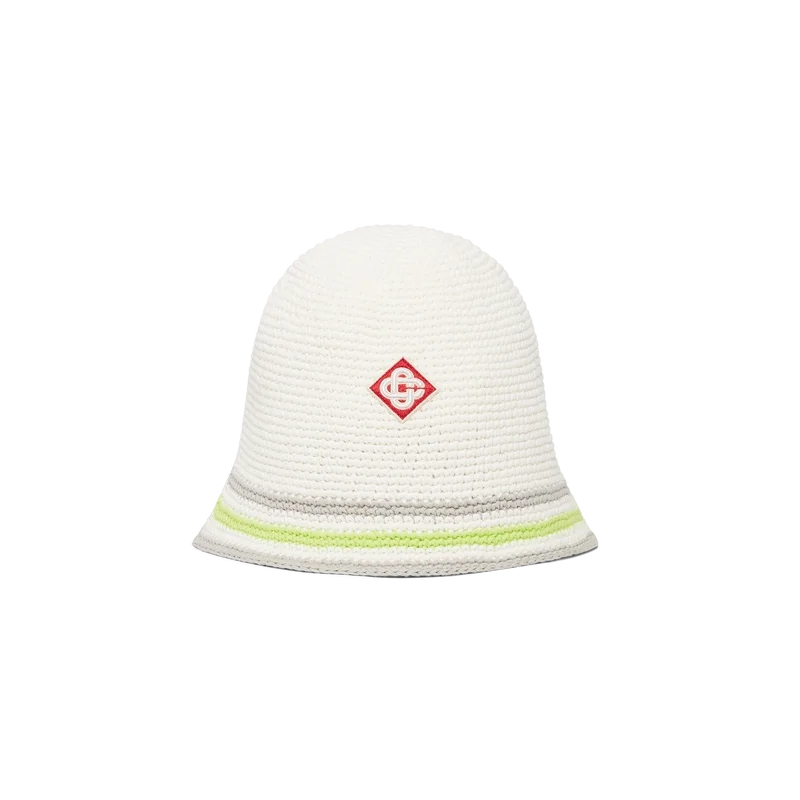 Die gestreifte Häkelmütze ist eine klassische Bucket-Silhouette aus einem weichen, strukturierten, offen gewebten Häkelbaumwollstoff – das ultimative Sommer-Must-have. Abgerundet durch eine grün, grau und weiß gestreifte Krempe und eine Casablanca-Glas-Logo-Applikation in der Mitte.