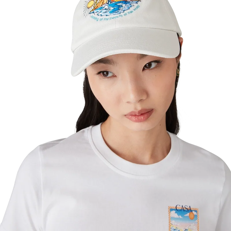 Die Oasis Cap ist eine klassische Baseballkappe aus Baumwollstoff mit dem saisonalen Artwork des Hauses, das Designelemente aus Natur, Architektur und Tennis vereint. Abgerundet durch einen Schirm und eine vergoldete, verstellbare Schnalle.