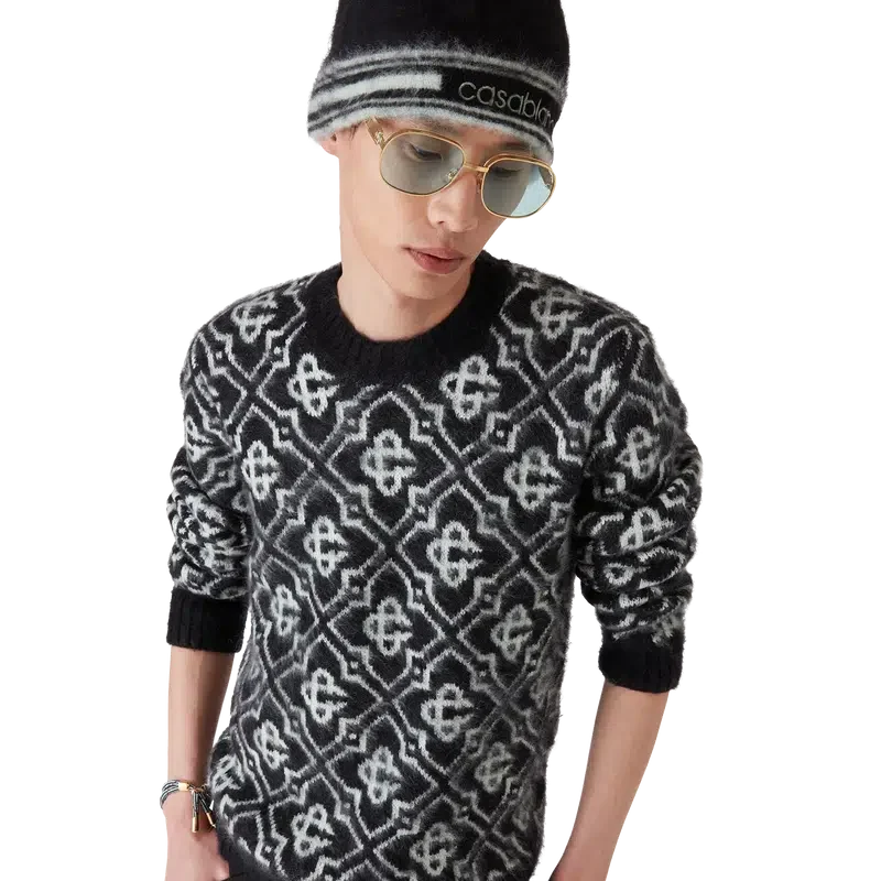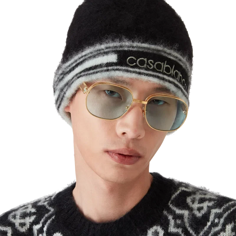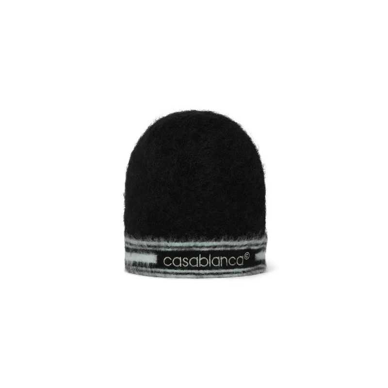 Die gestreifte Mohair-Mütze ist ein Strickmodell aus Mohairstoff. Abgerundet wird sie durch das Casablanca-Logo und Streifenverzierungen am Rand.