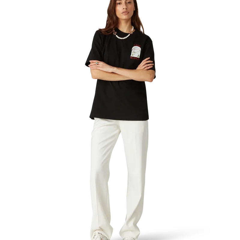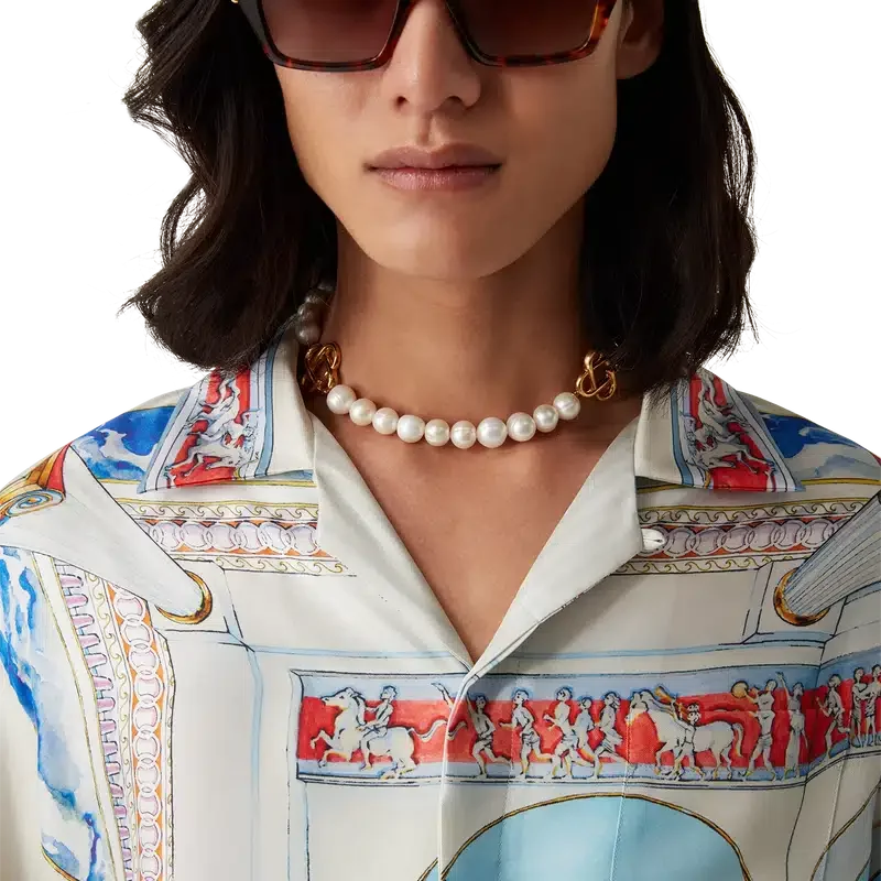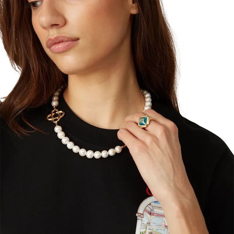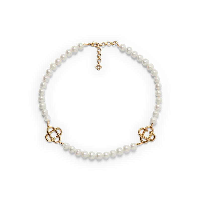 Die Halskette „Medium Pearl Logo“ trägt das Casablanca-Logo quer über den Hals und ist so gestaltet, dass sie eng anliegt. Die Halskette ist 18 Karat vergoldet und mit 30 großen Süßwasserperlen besetzt.