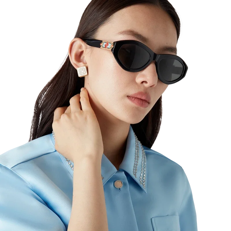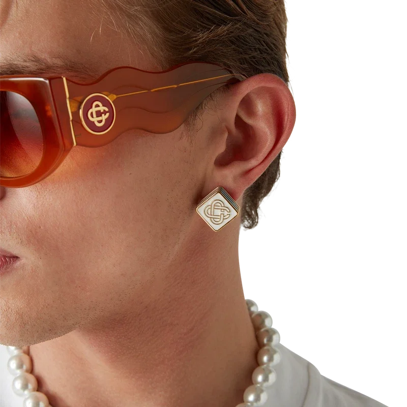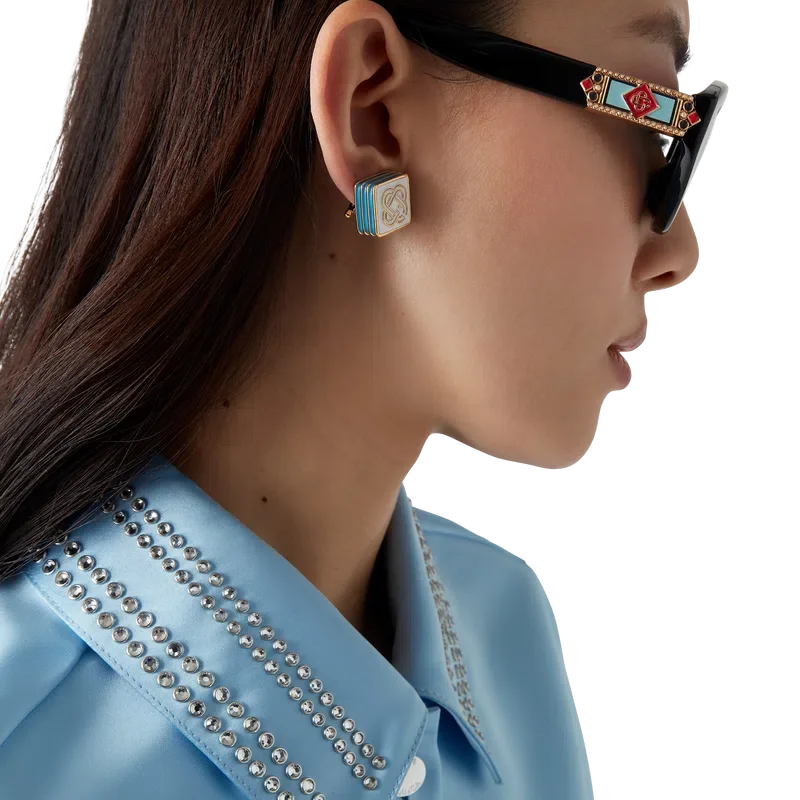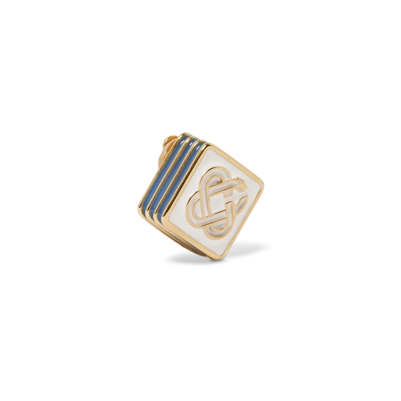Die Monogram-Logo-Ohrstecker sind ein Paar diamantförmige Ohrringe mit dem ineinander verschlungenen CC-Logo des Hauses – entworfen für Ohrlöcher – gefertigt aus Emaille, Kunstperlen und vergoldetem Messing. Abgerundet durch einen Schmetterlingsverschluss.