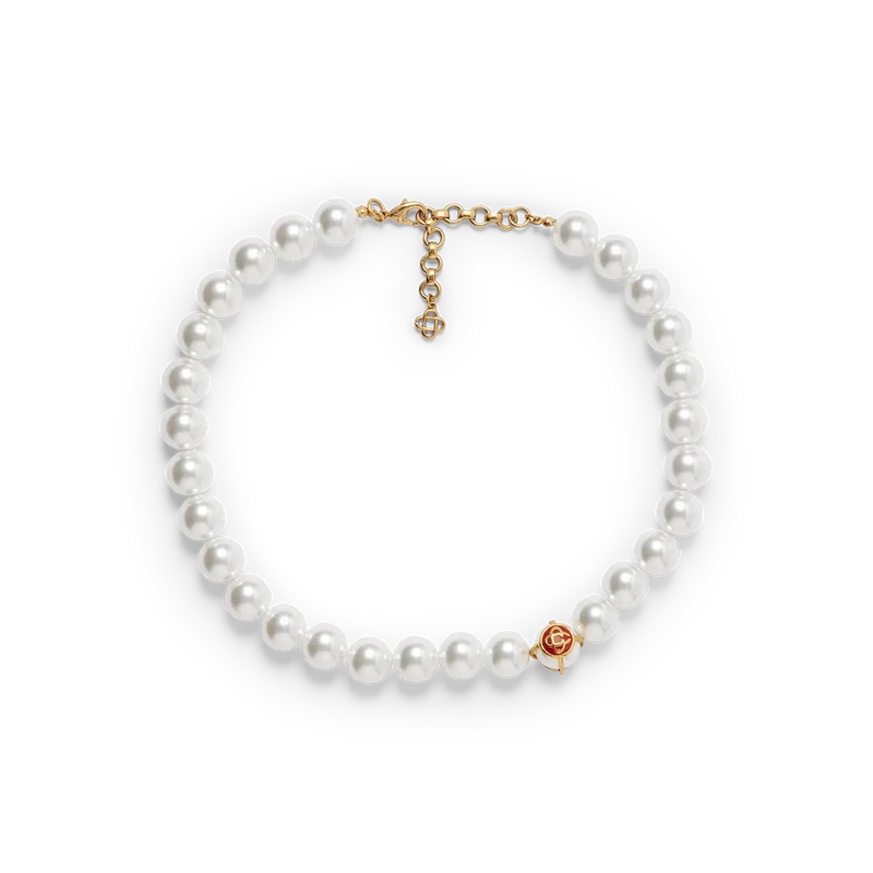 Die Caged Pearl Halskette ist aus vergoldetem Messing und Kunstglasperlen gefertigt und ziert das charakteristische Diamant-Logo des Hauses. Abgerundet durch eine vergoldete Kette und einen Karabinerverschluss – dieses Stück wird mit einer Geschenkbox, einem Staubbeutel mit Markenlogo und einer Produktbroschüre geliefert.