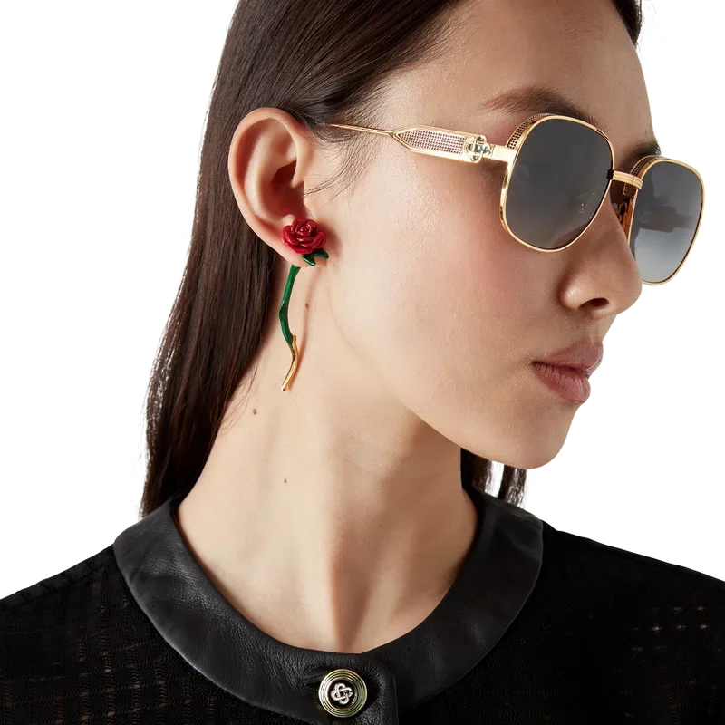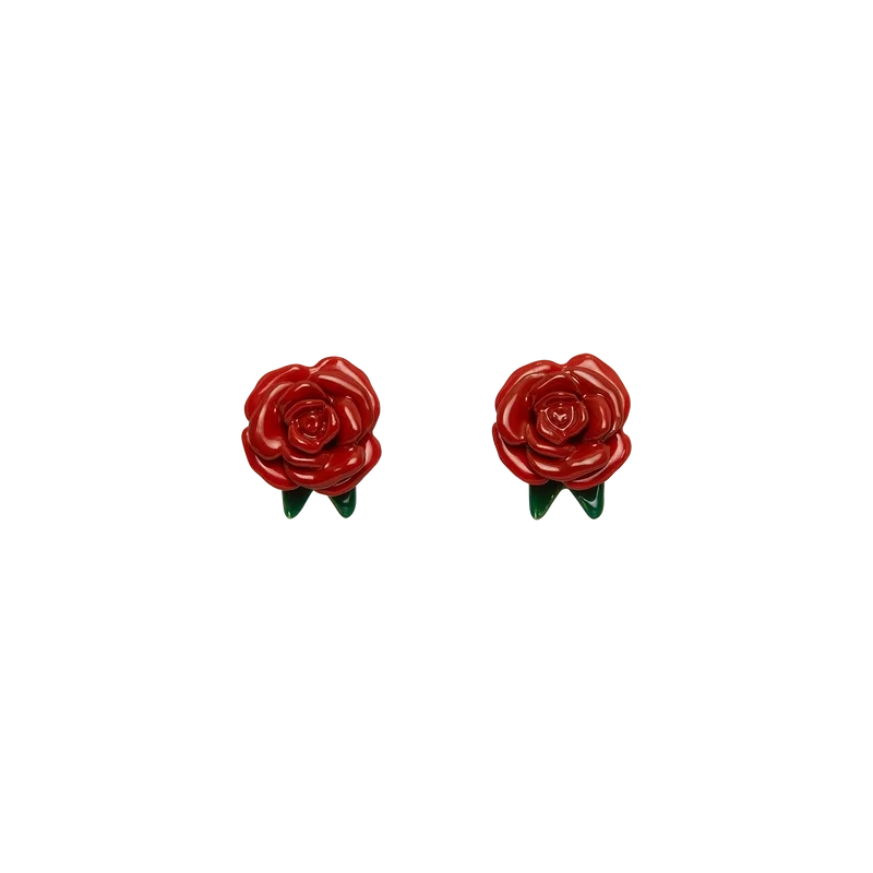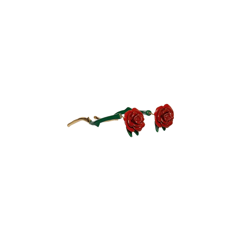 Die Rose Drop Ohrringe sind ein Paar Ohrringe, die die Form einer Rose haben, deren Stiel durch das Ohr sticht. Sie bestehen aus handbemaltem Emaille und vergoldetem Messing. Dieser Artikel ist ausschließlich für Ohrlöcher bestimmt.